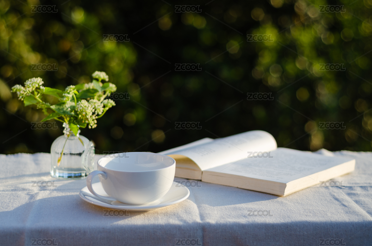 茶桌,书本,花园,阳光,树木,花朵,茶壶,茶杯,惬意,休闲