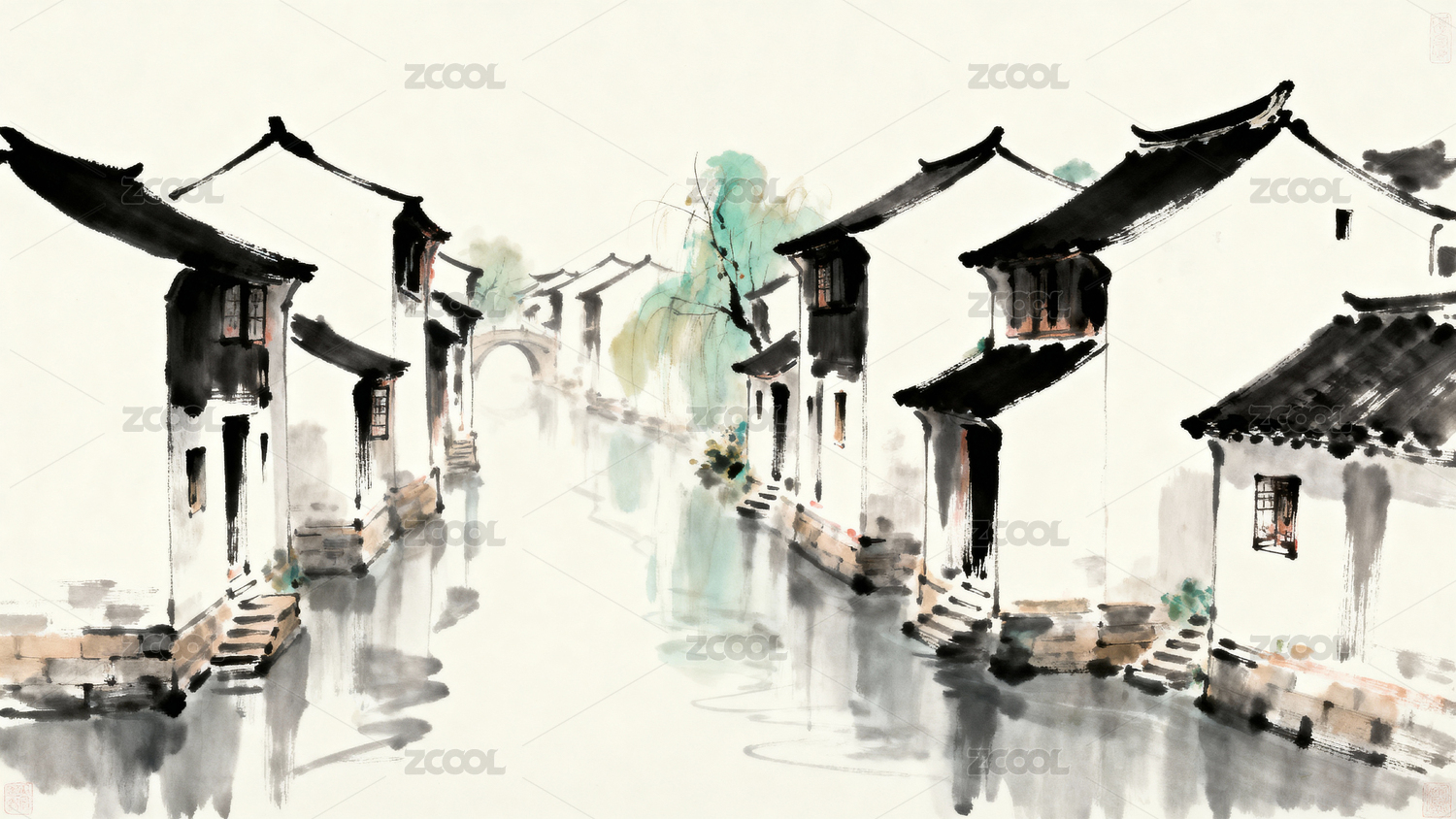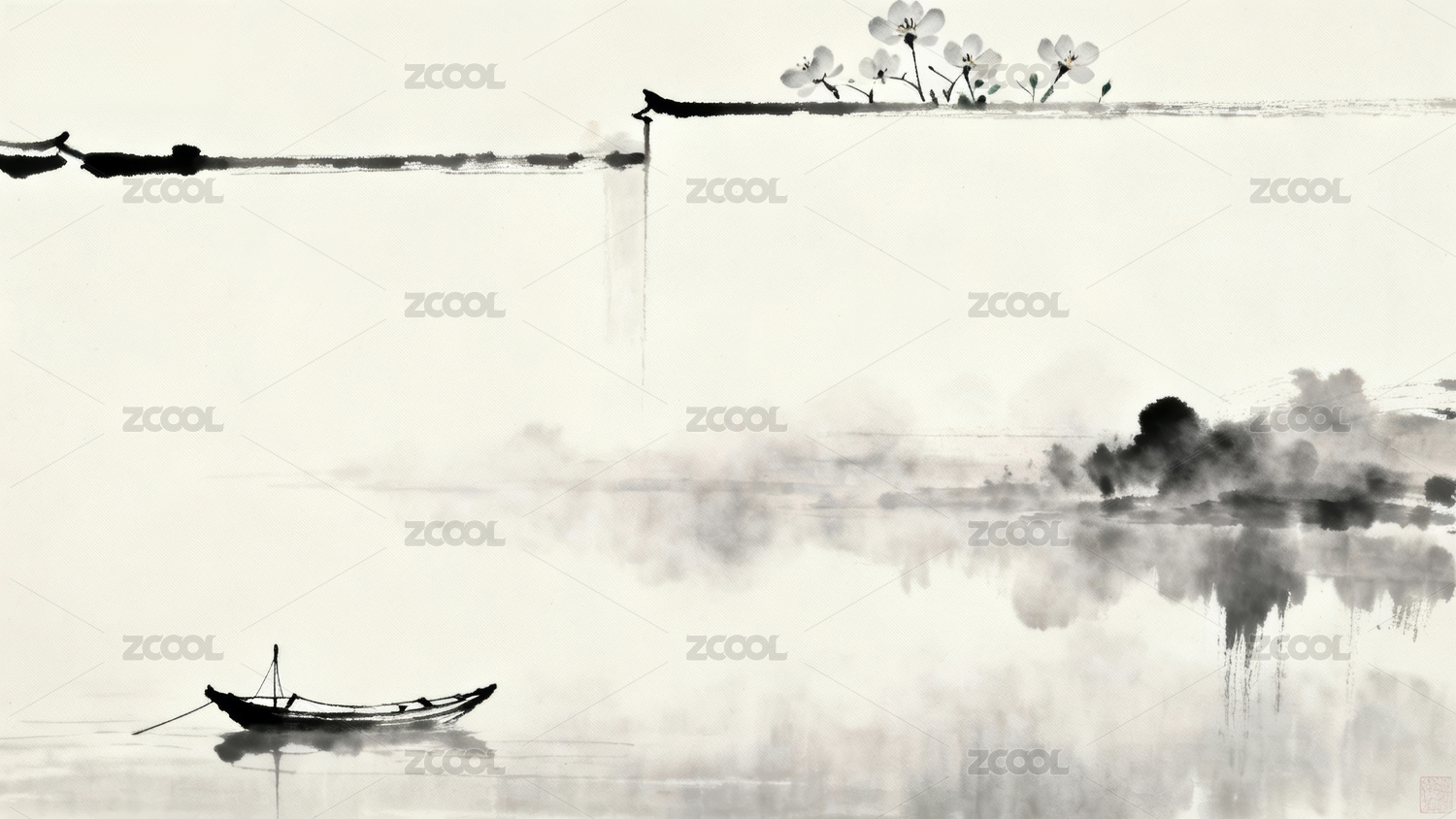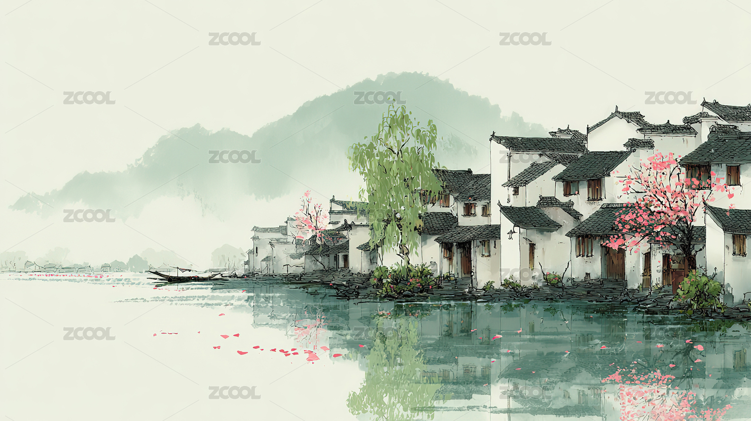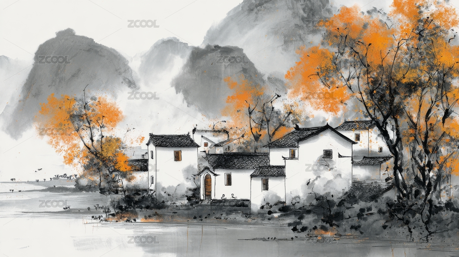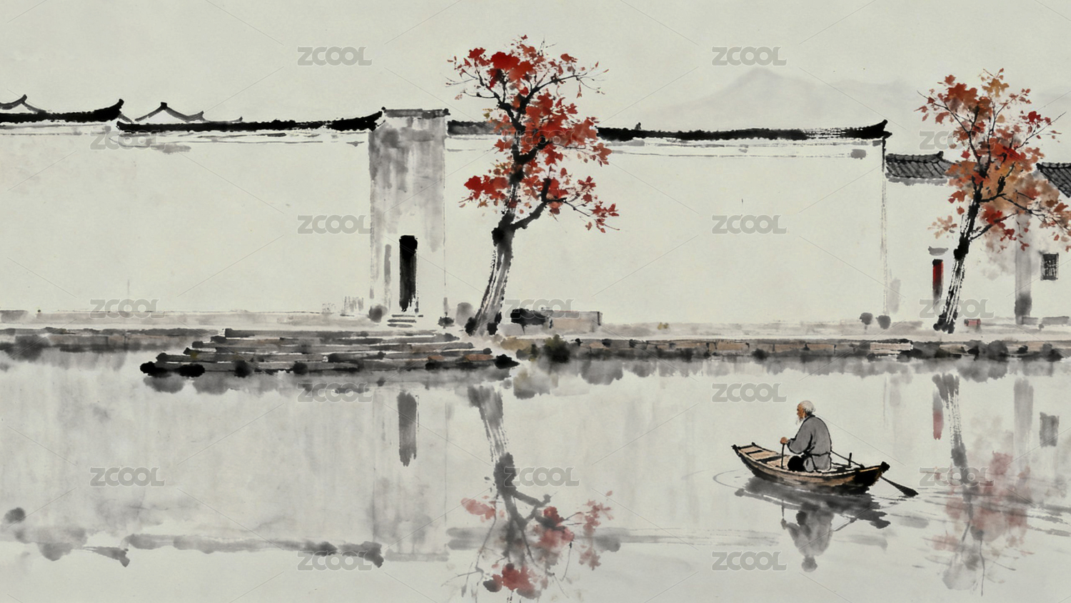 江南水乡,水墨画,古镇,红叶,小船,乌篷船,秋景,山水,倒影,意境