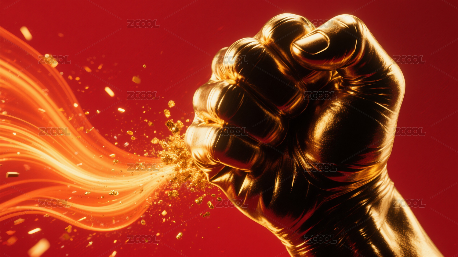 金色拳头在红色背景前伴动态线条与金粉飞溅