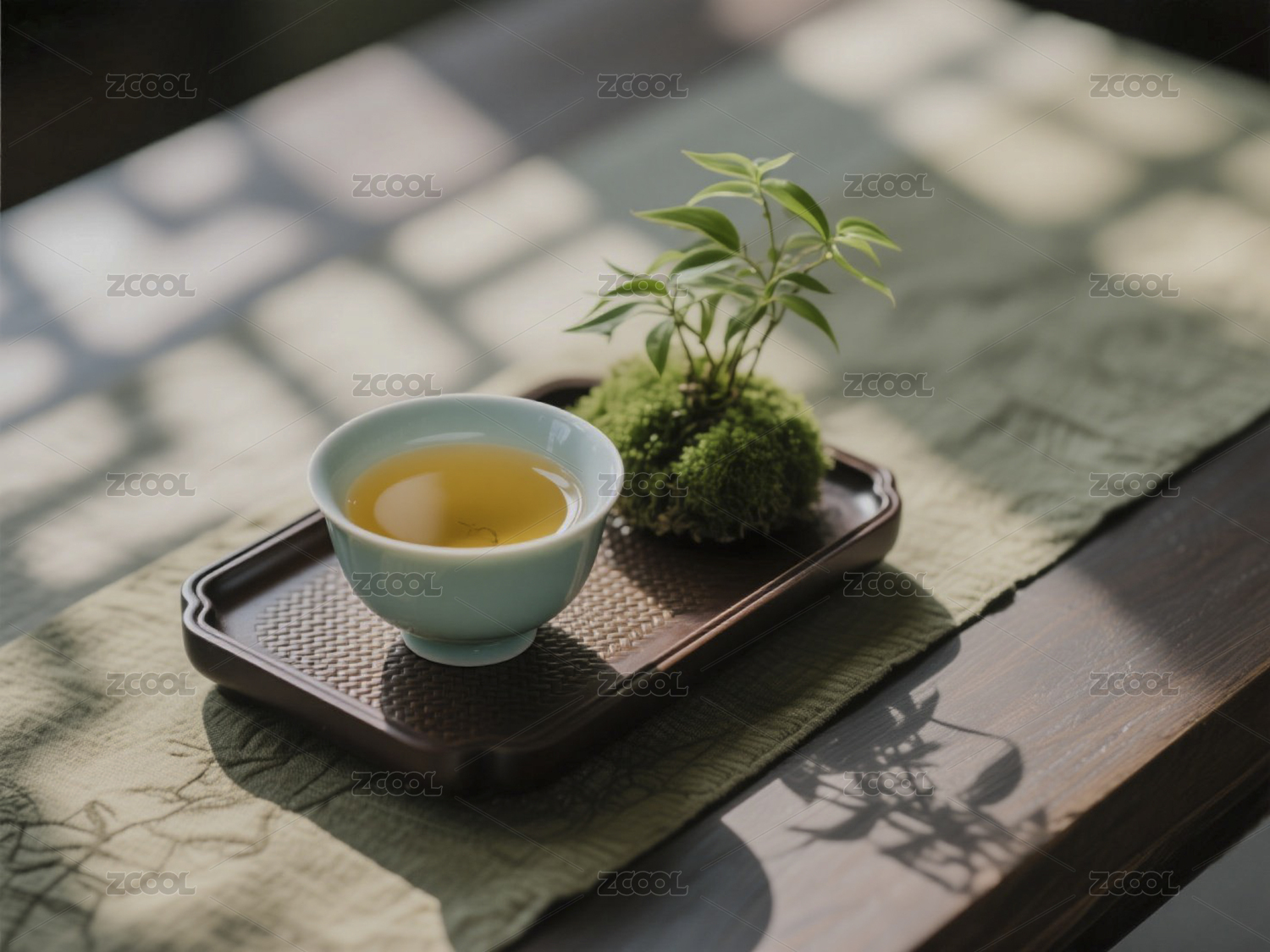 茶杯,松枝,禅意,映像,镜子,自然,艺术,传统,文化,平衡