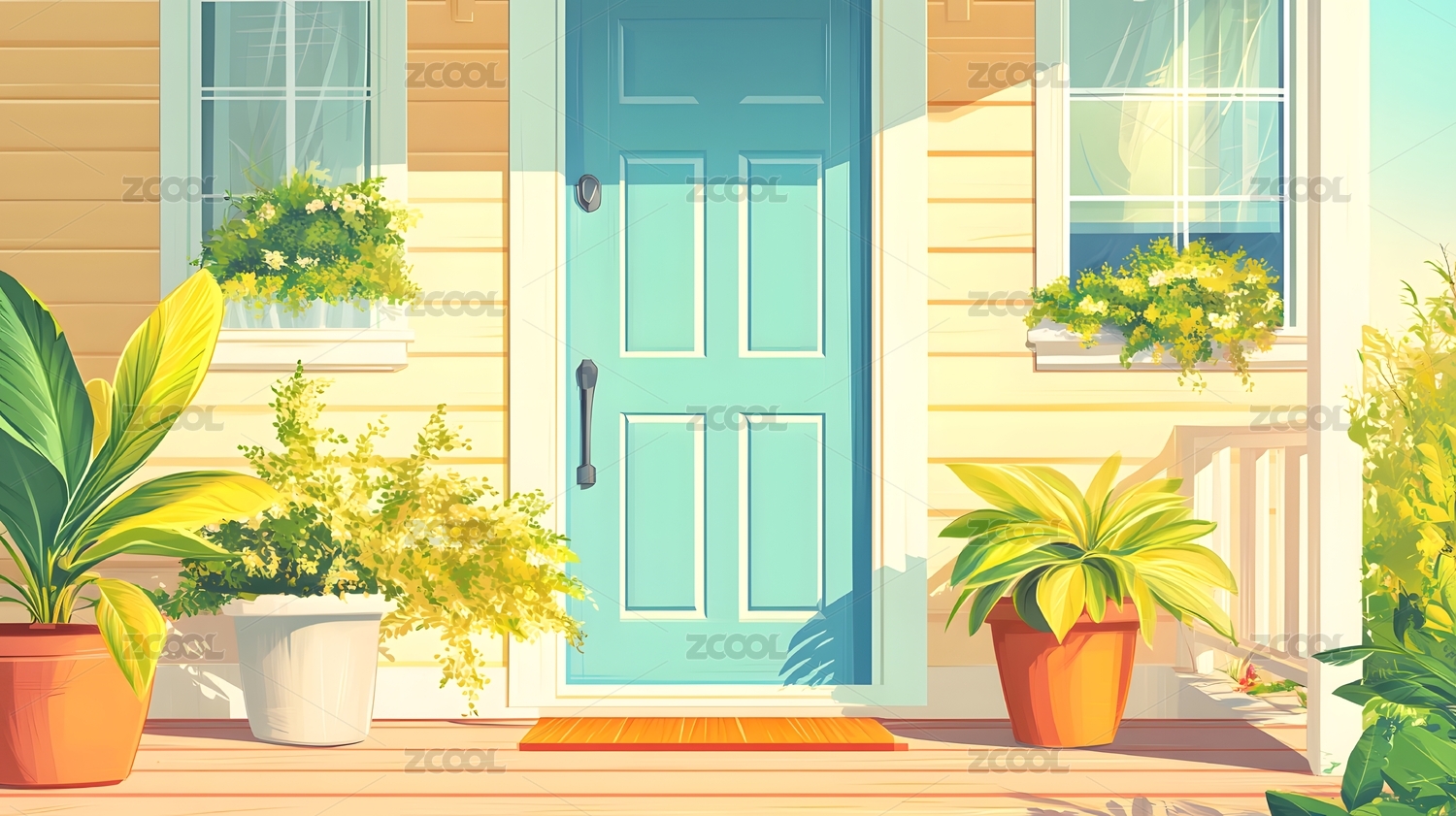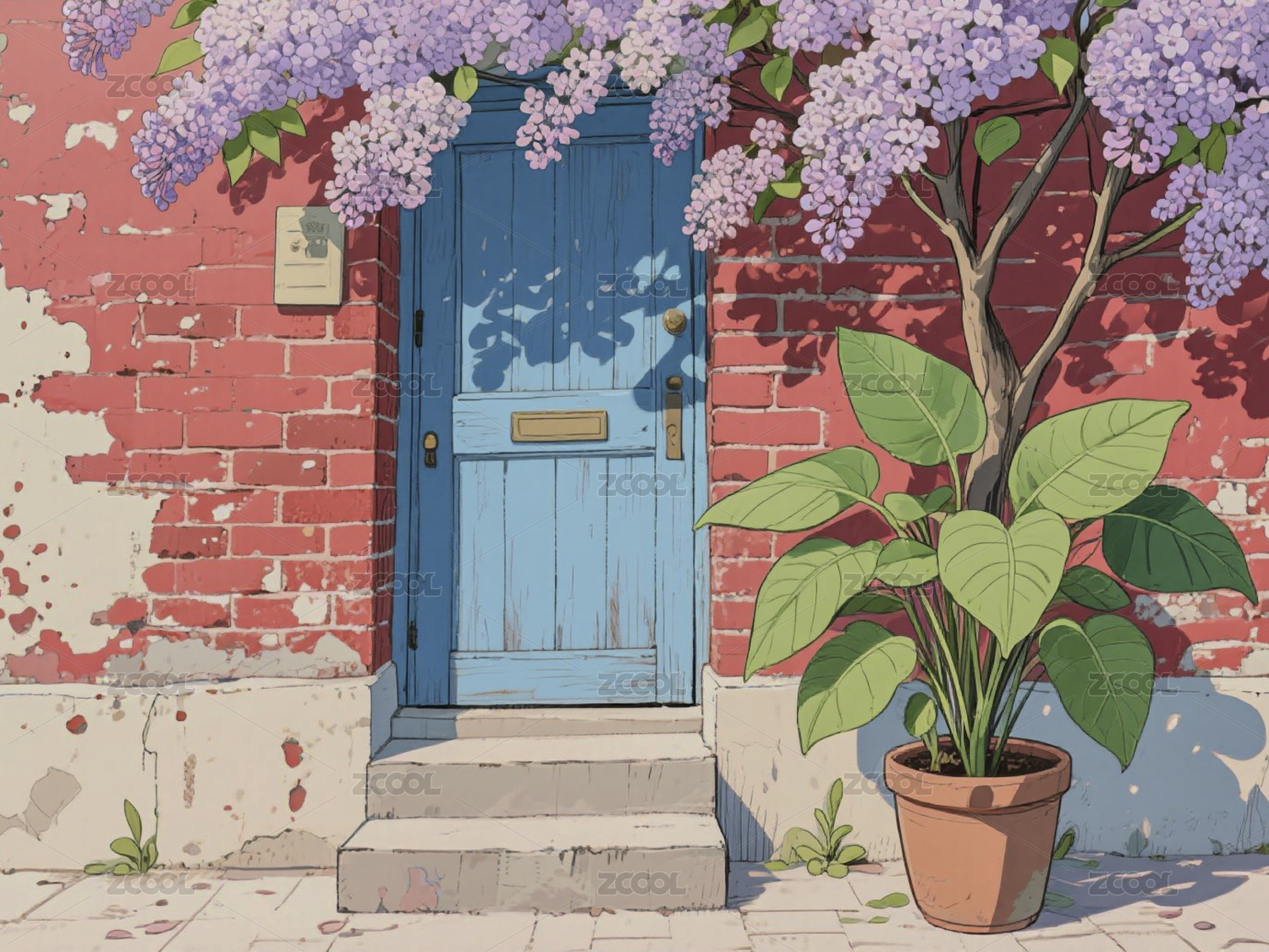 红墙,蓝门,紫藤花,砖墙,木门,复古,花卉,盆栽,绿叶,台阶