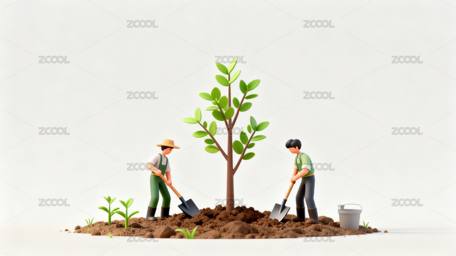 两人合力种树场景
