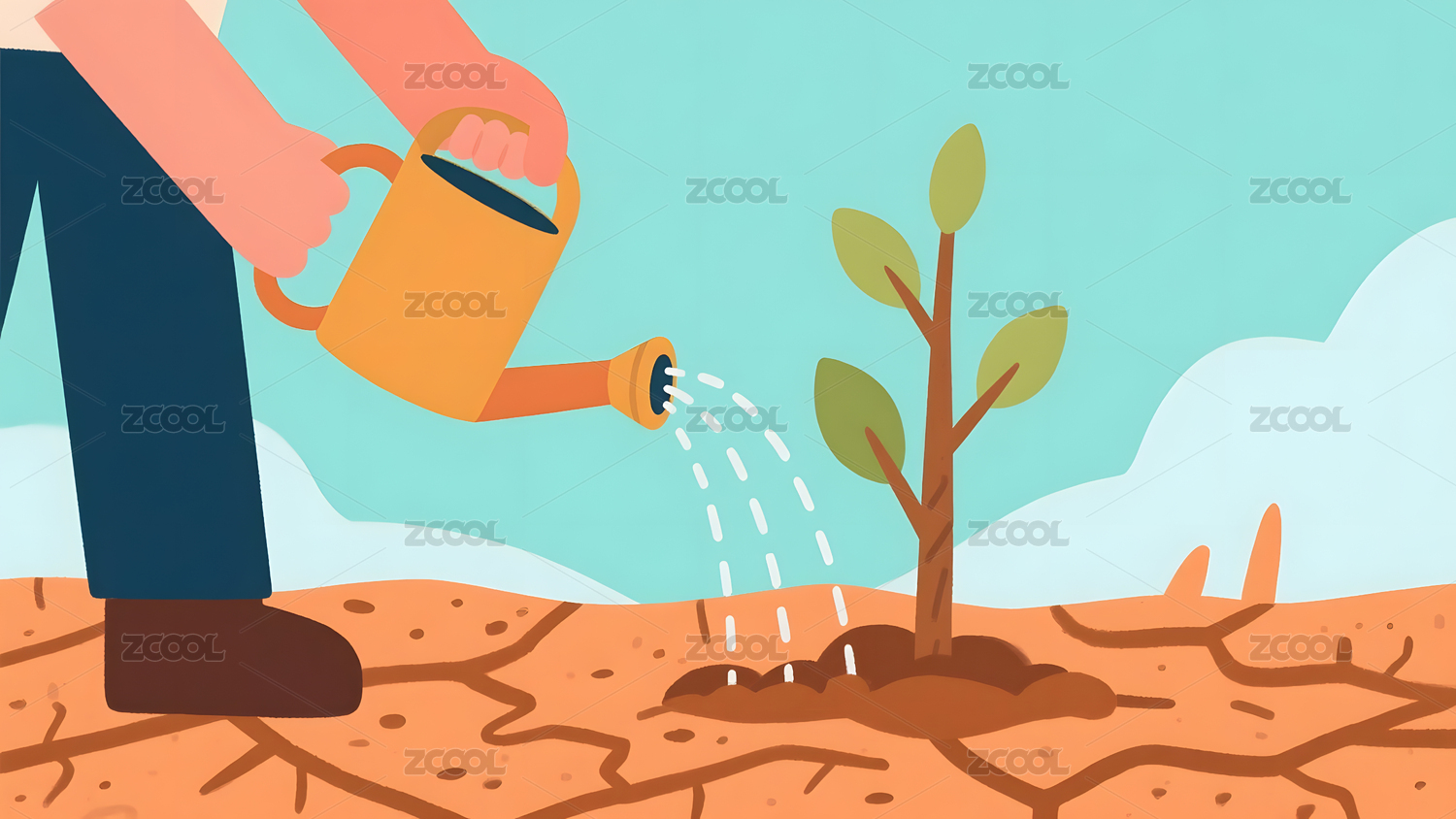 给干涸土地上的树苗浇水
