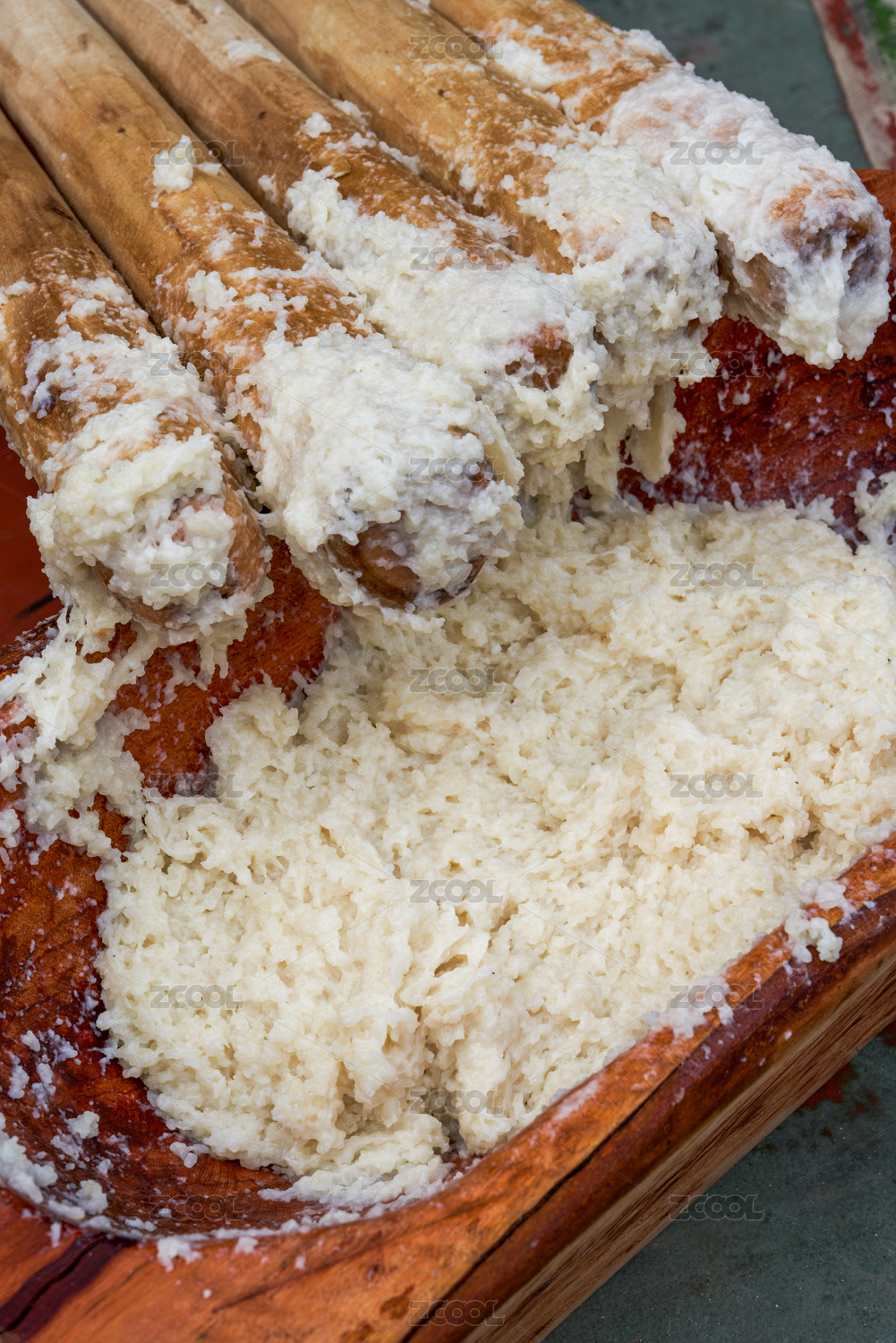 广西壮族特色打米糕,一群人用木棒锤糯米