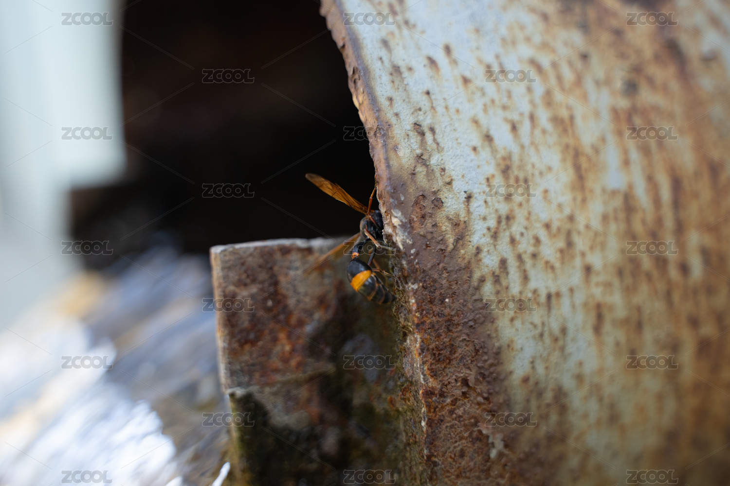 生锈管道上的黄蜂马蜂