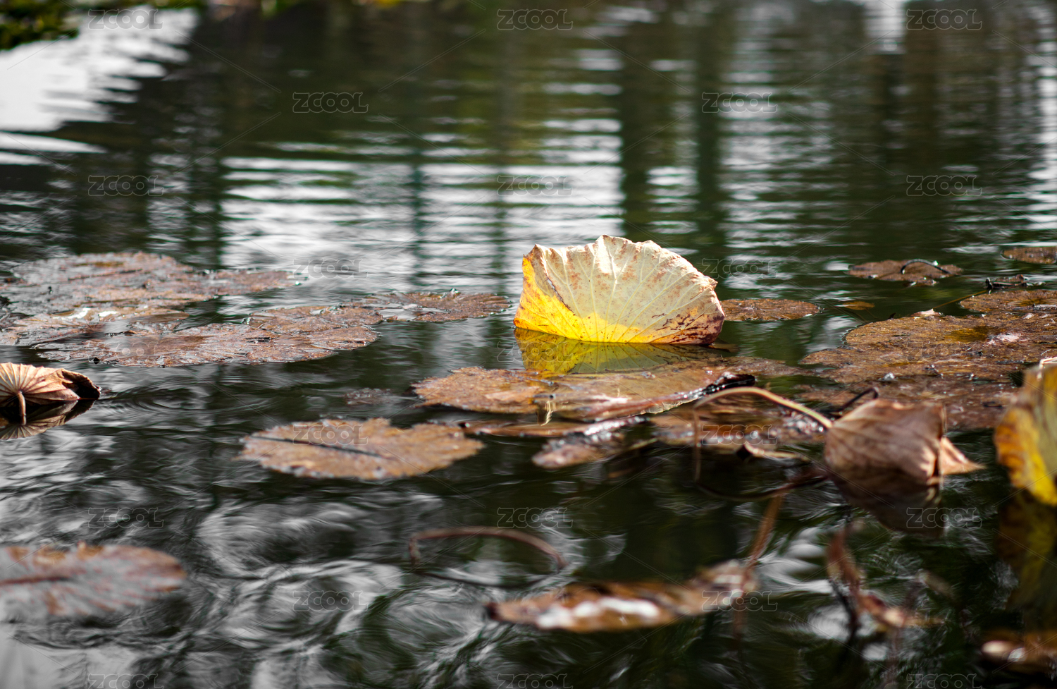深秋水里即将枯萎的荷叶