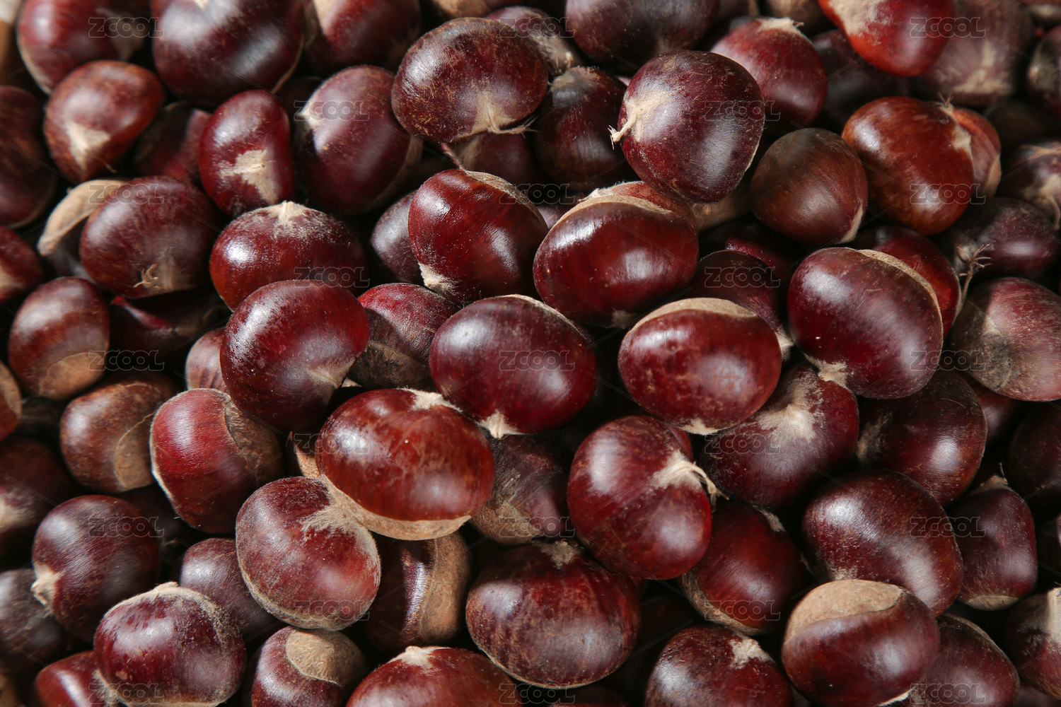 黑色背景桌面上摆满新鲜采摘下的野生栗子