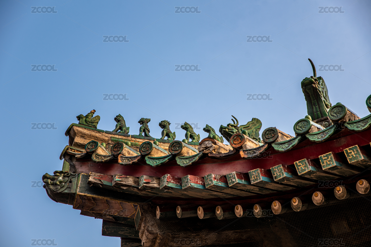古代建筑屋脊雕塑琉璃,天空背景历史文物屋