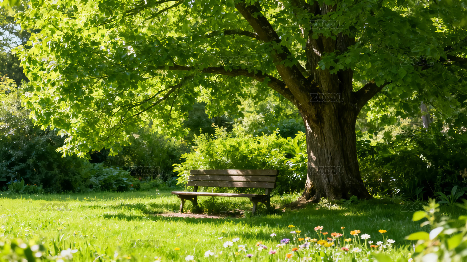 草地上绿树下的长椅