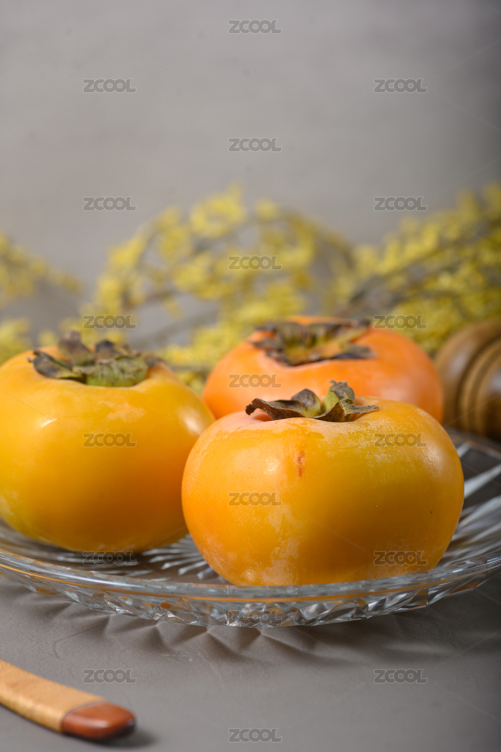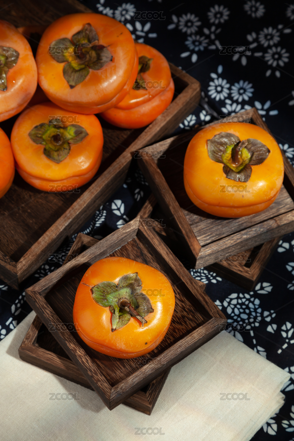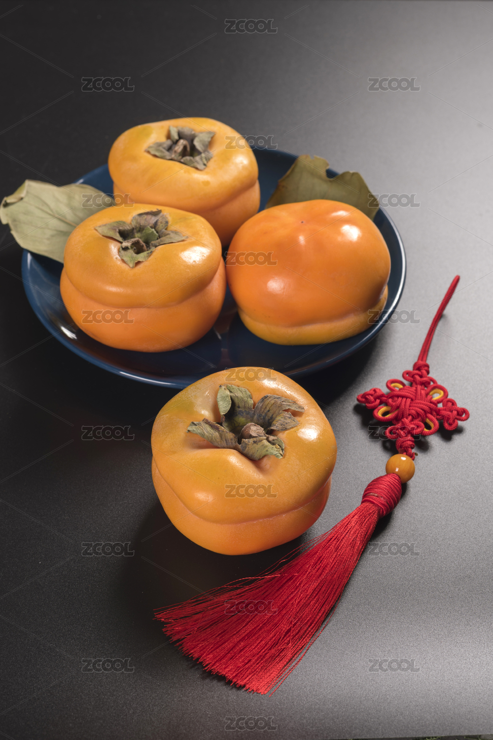 柿子,中国结,木质托盘,绿叶,纯色背景,静物,应季水果,丰收