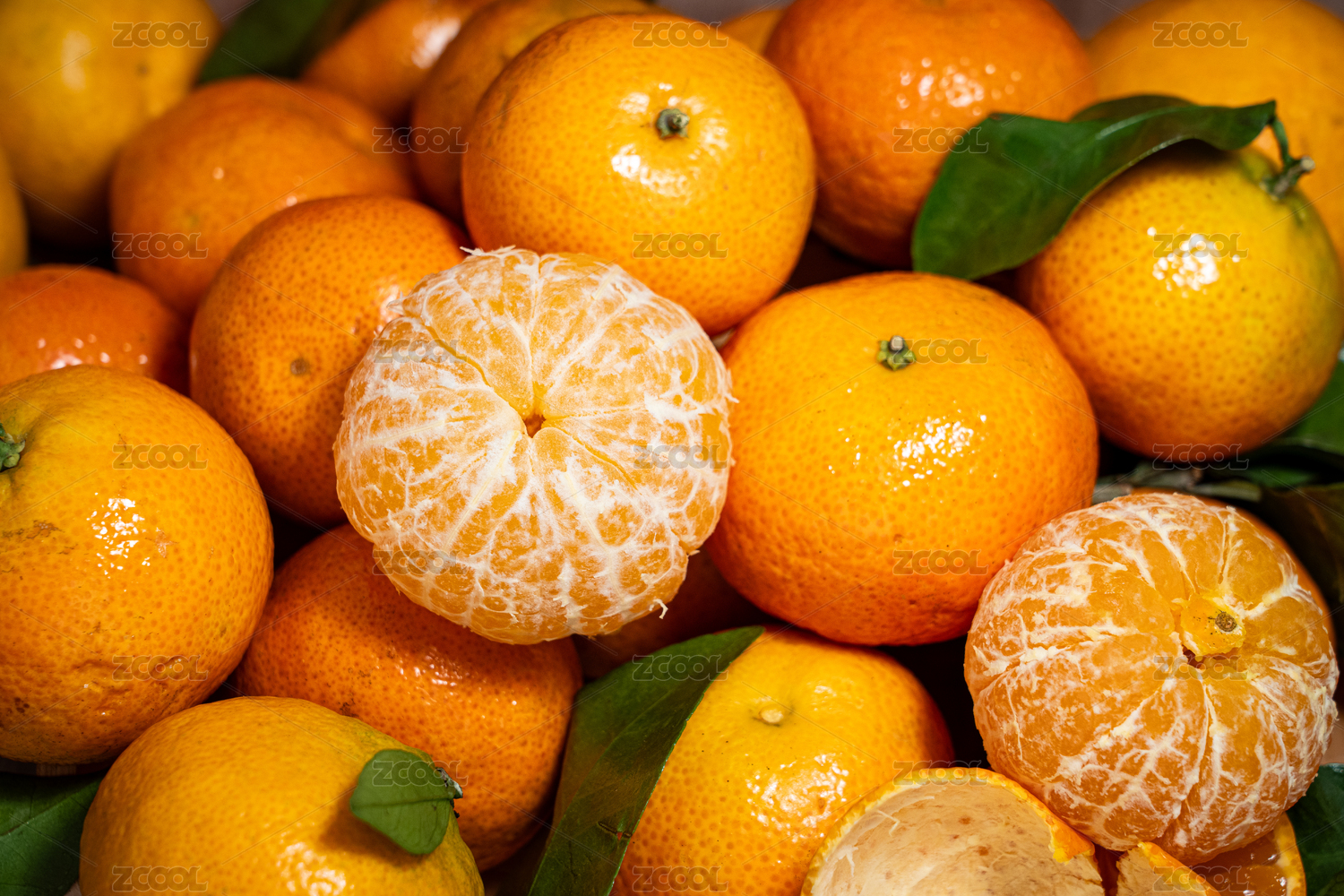 桔子,金钱蜜橘,柑橘类水果,带叶子的桔子,绿叶,剥开的桔子,桔子果肉,生鲜,应季水果,丰收