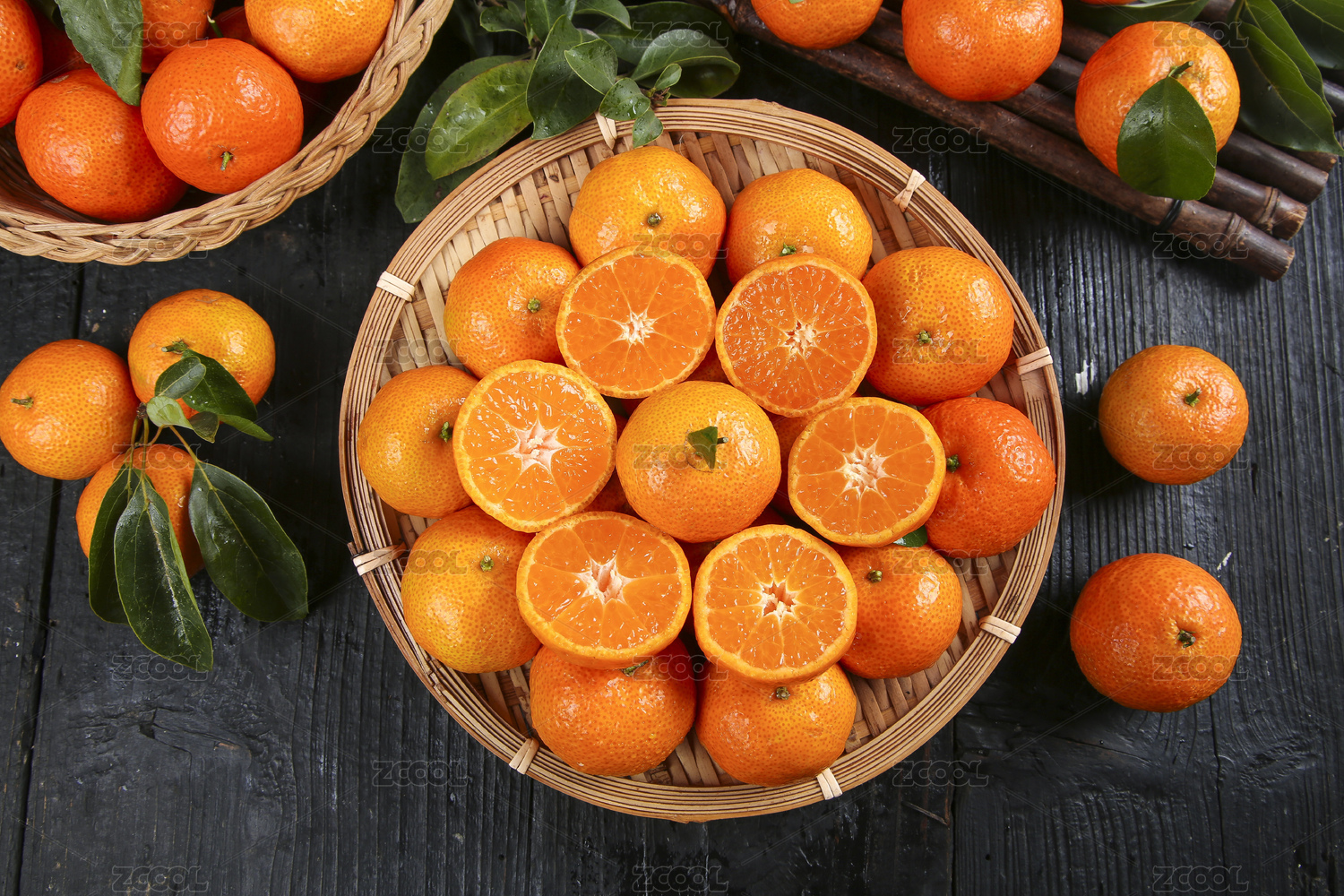 黑底上放着一蓝新鲜砂糖橘和切面的砂糖桔