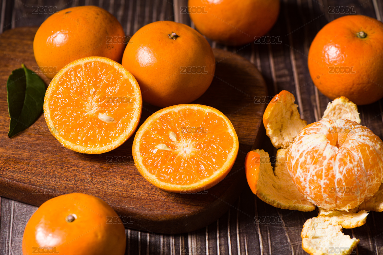 桔子,蜜桔,柑橘类水果,应季水果,丰收季节,农业产品,绿叶,带叶子的新鲜桔子,剥开果肉,切开的桔子