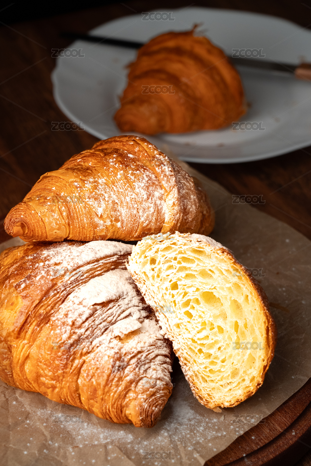 牛角包,面包,奶油可颂,糖粉,杏仁片,早餐,零食,学生早餐,静物,全麦食品