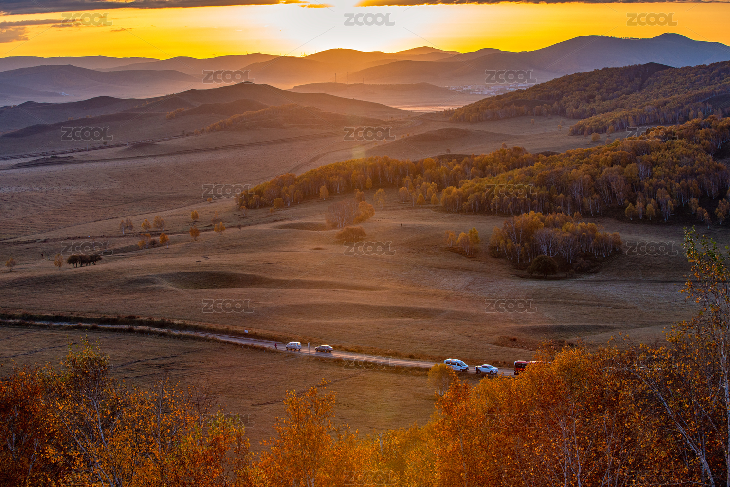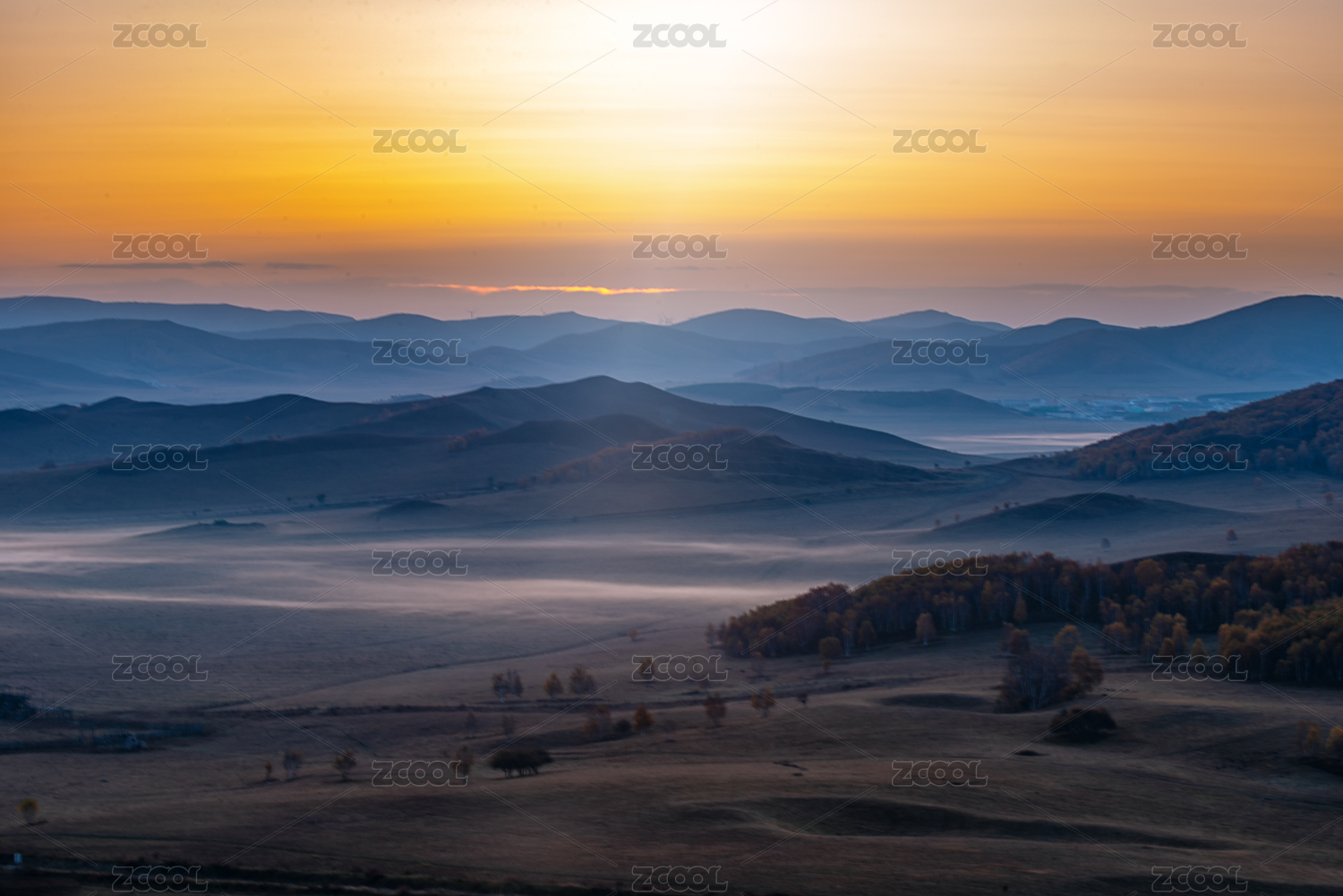 秋天日出下内蒙古坝上桦木沟的山坡草原树林