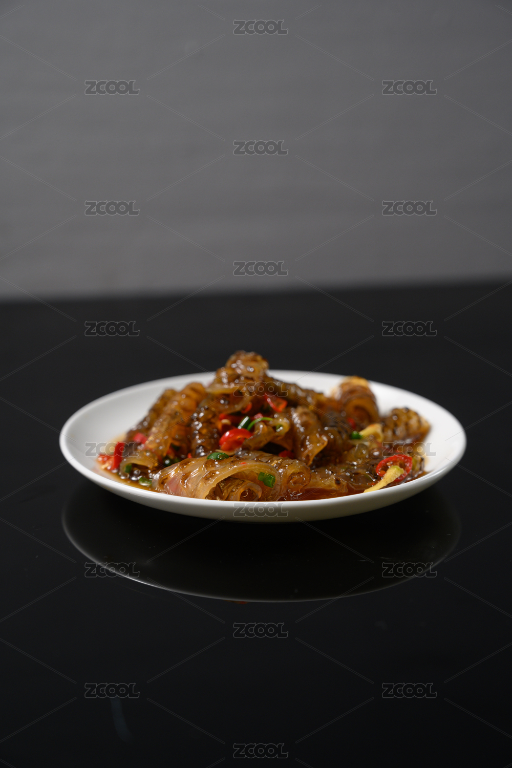 桌面上的盘子里的美味可口的凉拌鱼皮