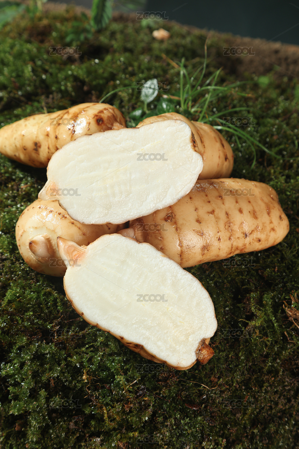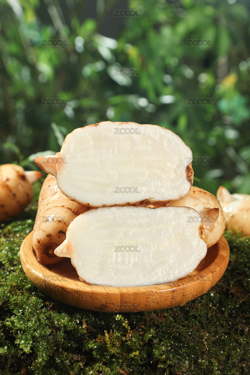 木板上放着一个完整的鲜魔芋和半边切面蒟蒻