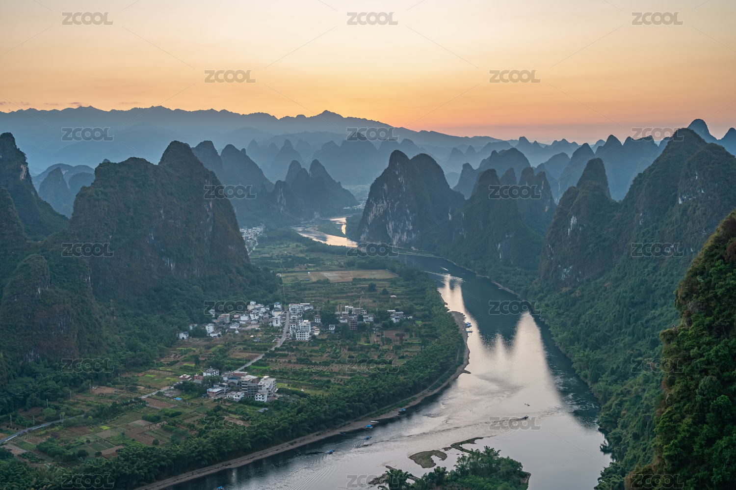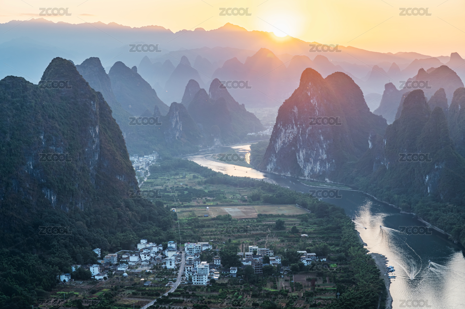 桂林兴坪古镇老寨山夕阳落日山水自然风光