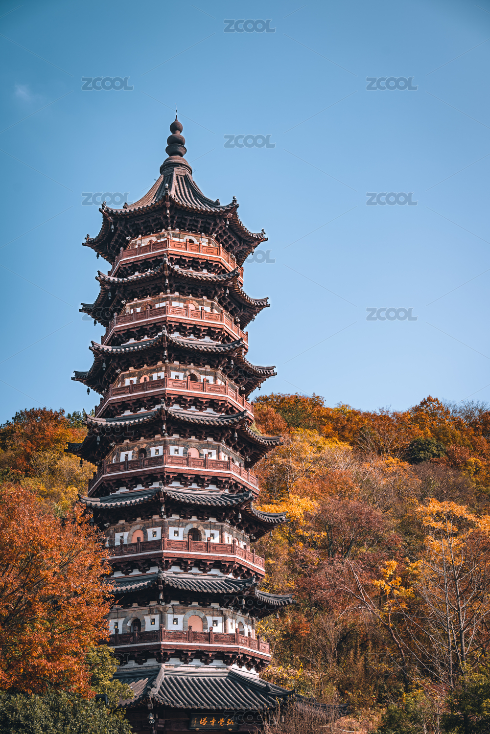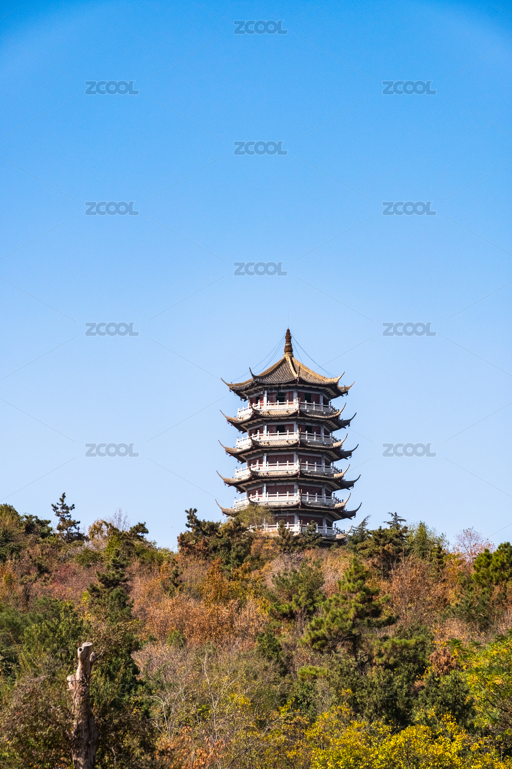 秋天远眺中国扬州观音山禅寺和大明寺栖灵塔