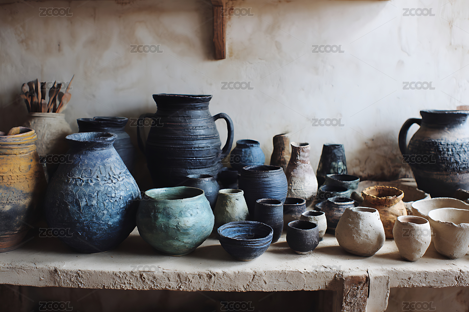 桌子上陶艺罐子组合