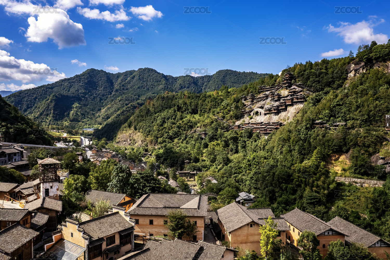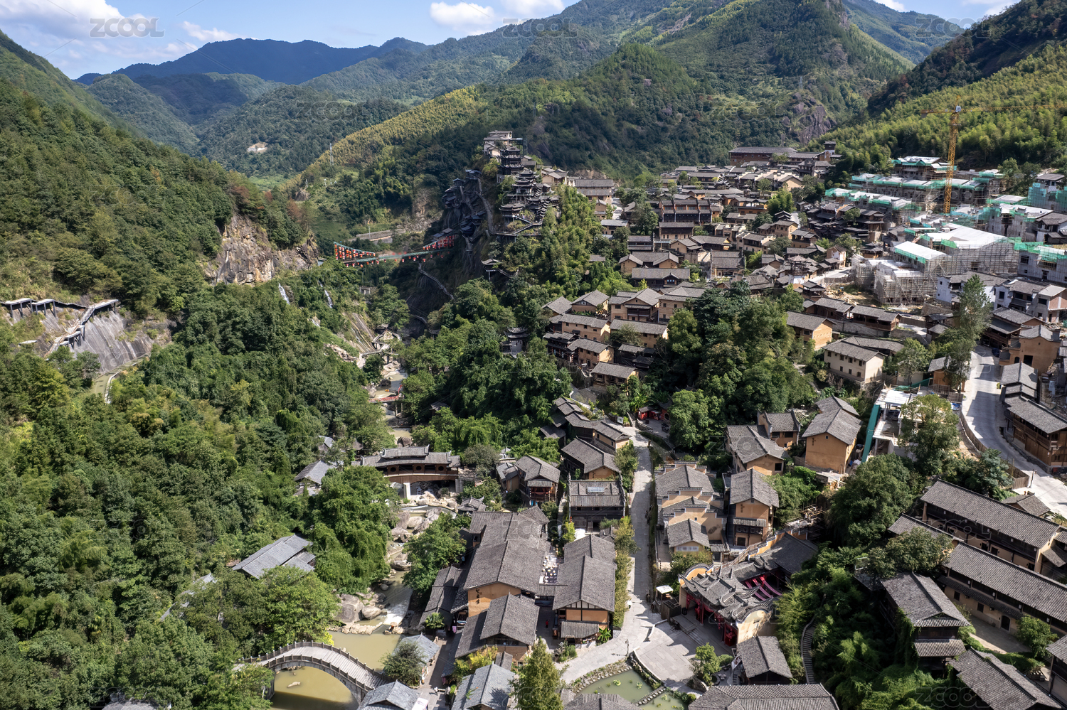 望仙谷,高山,人间天堂,航拍视角,悬崖峭壁,古民居群,山间古村落,自然环境,森林植被,悬崖栈道