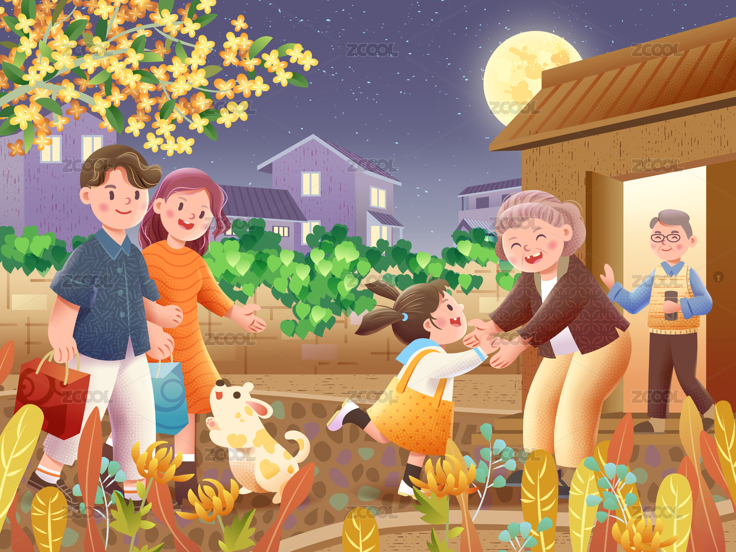 中秋节一家人团聚吃团圆饭传统国潮节日插画