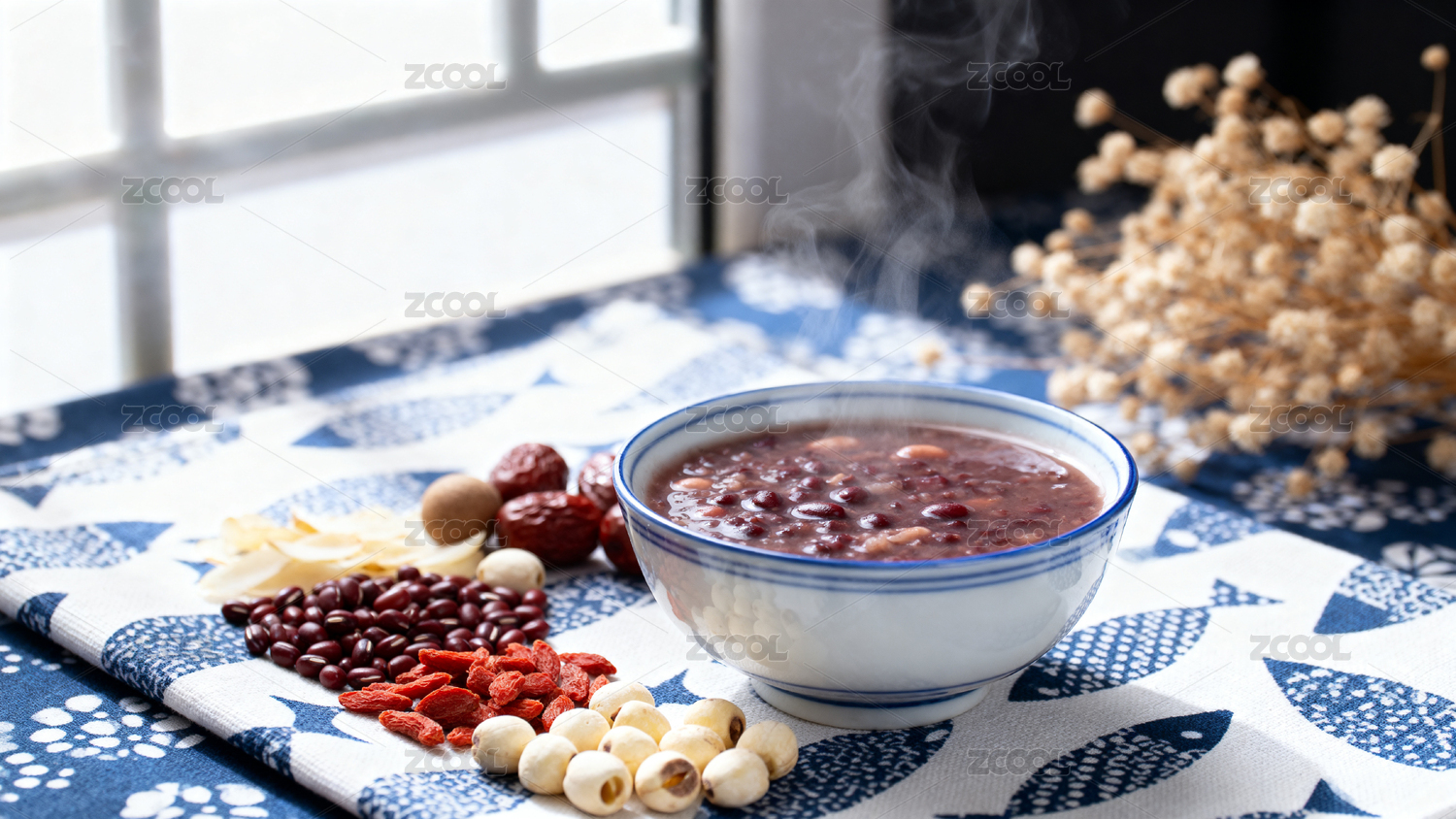 热气腾腾的红豆粥配莲子红枣