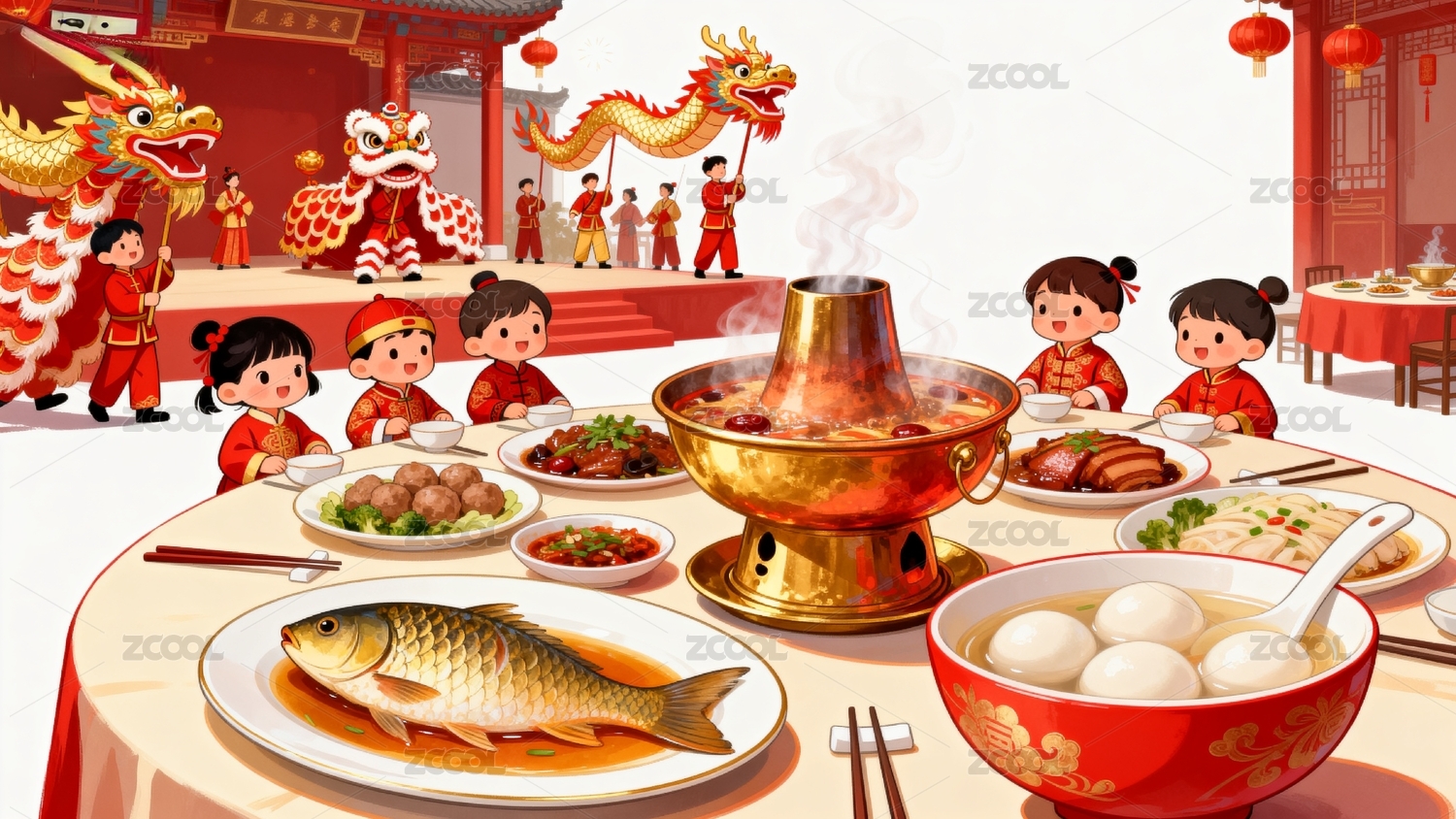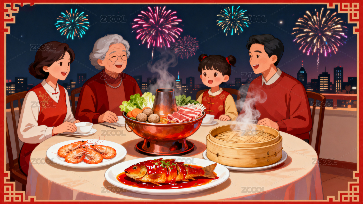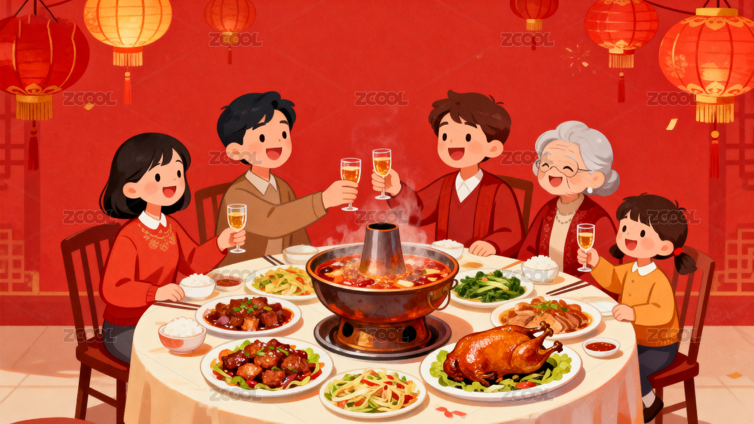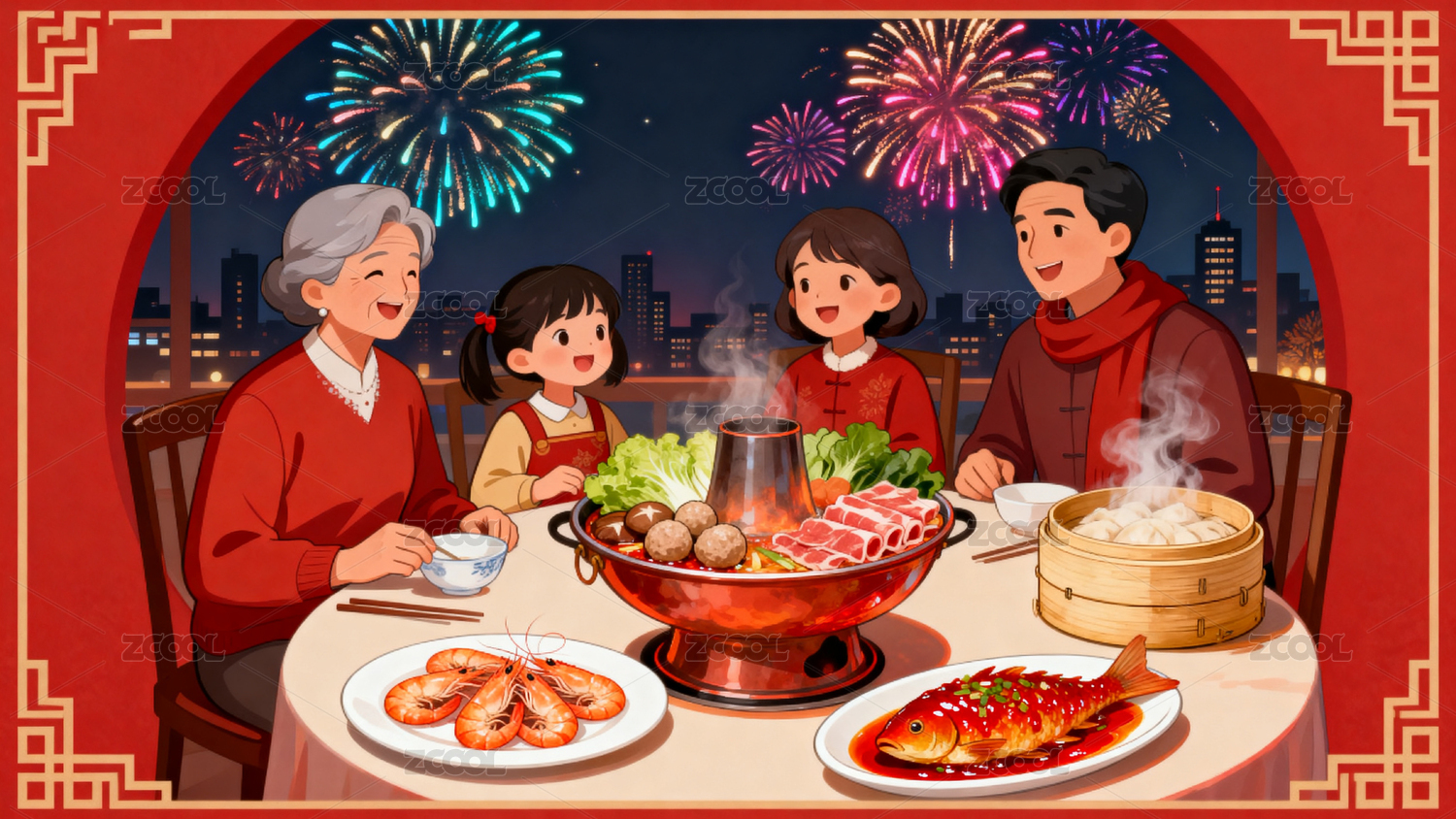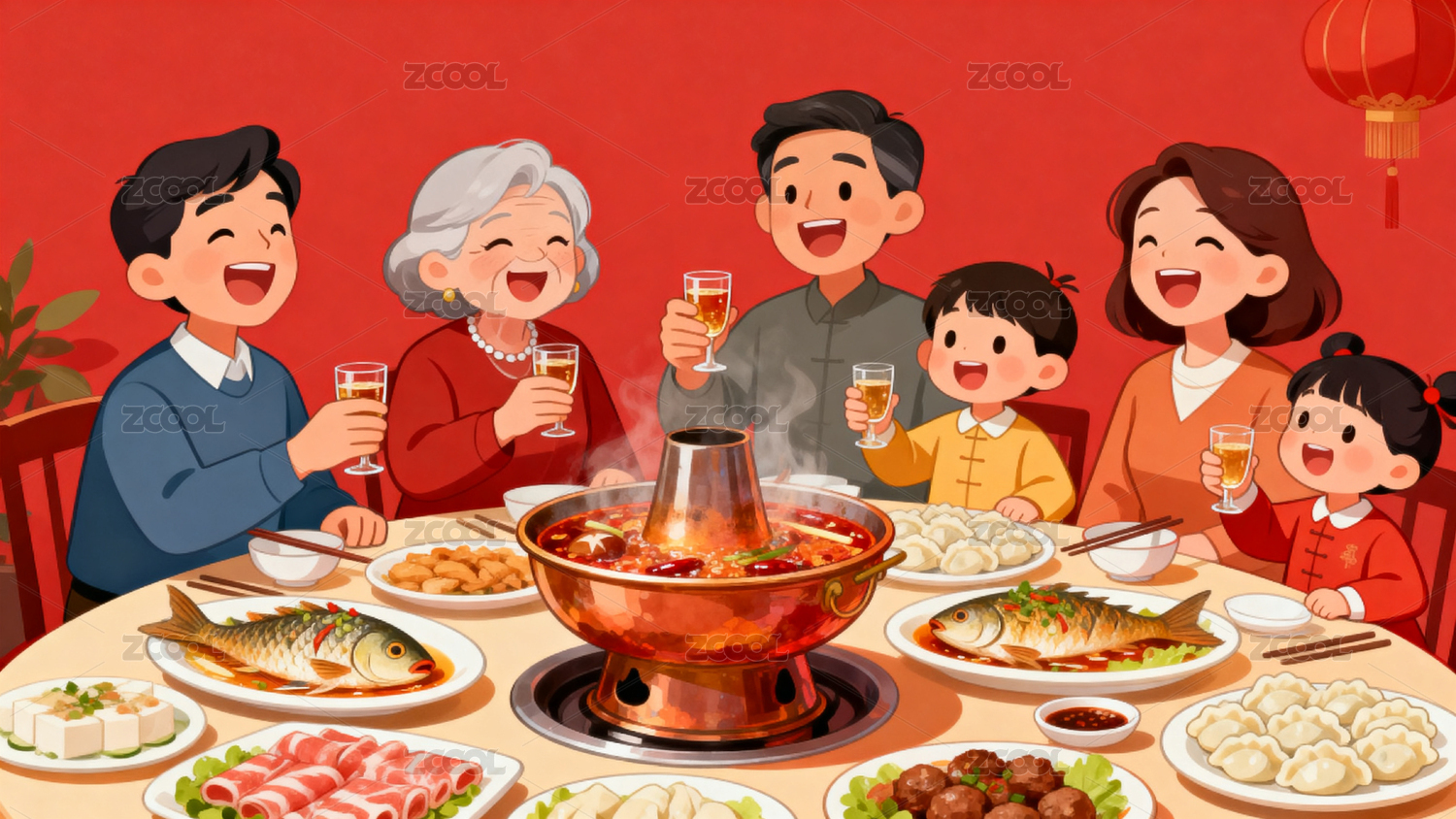 年夜饭团圆饭大年三十美食火锅菜肴矢量插画