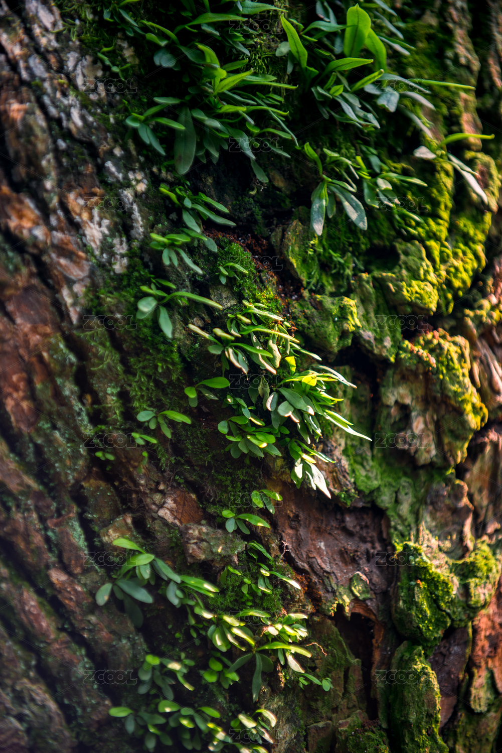 春天森林中树皮上生长的绿叶