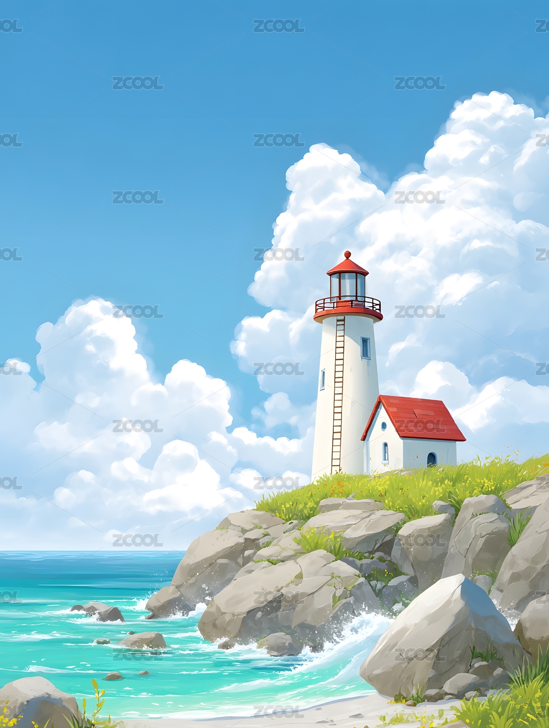 白天晴天海岸边岩石礁石上的灯塔插画绘画