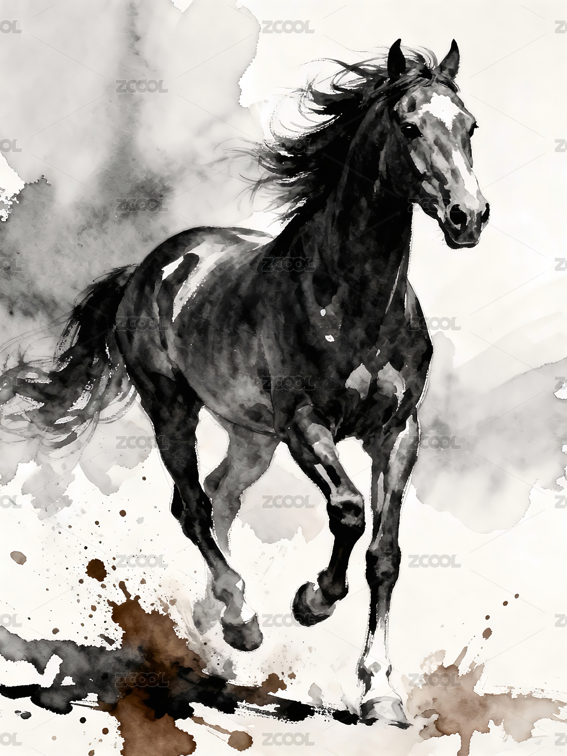 奔跑黑色骏马水墨晕染