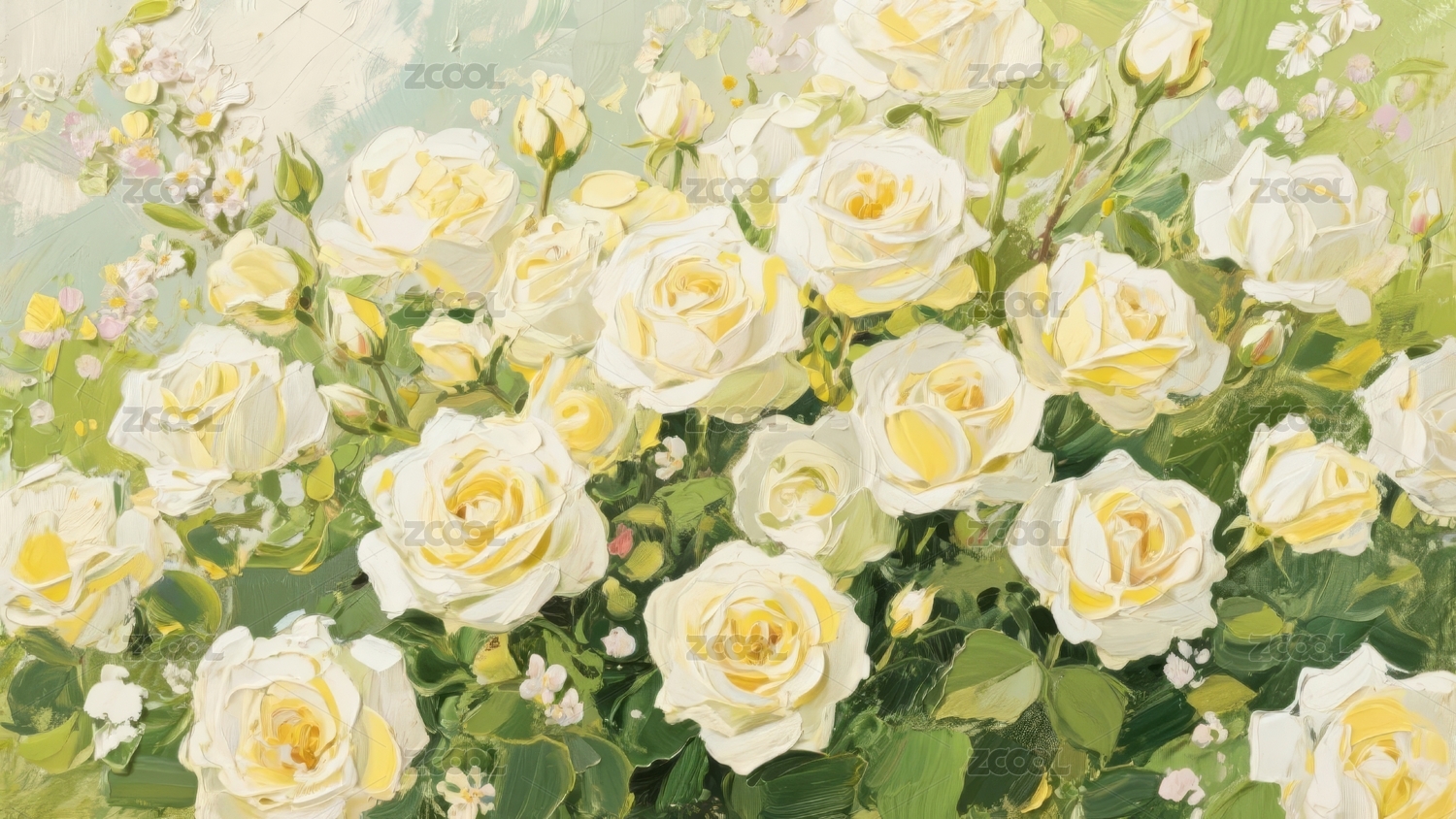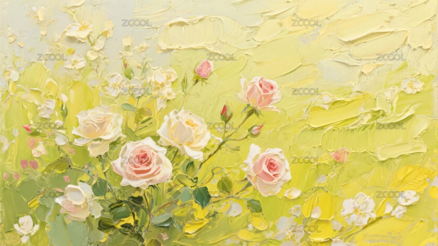 油画风格的淡黄色背景上的粉色与白色玫瑰花