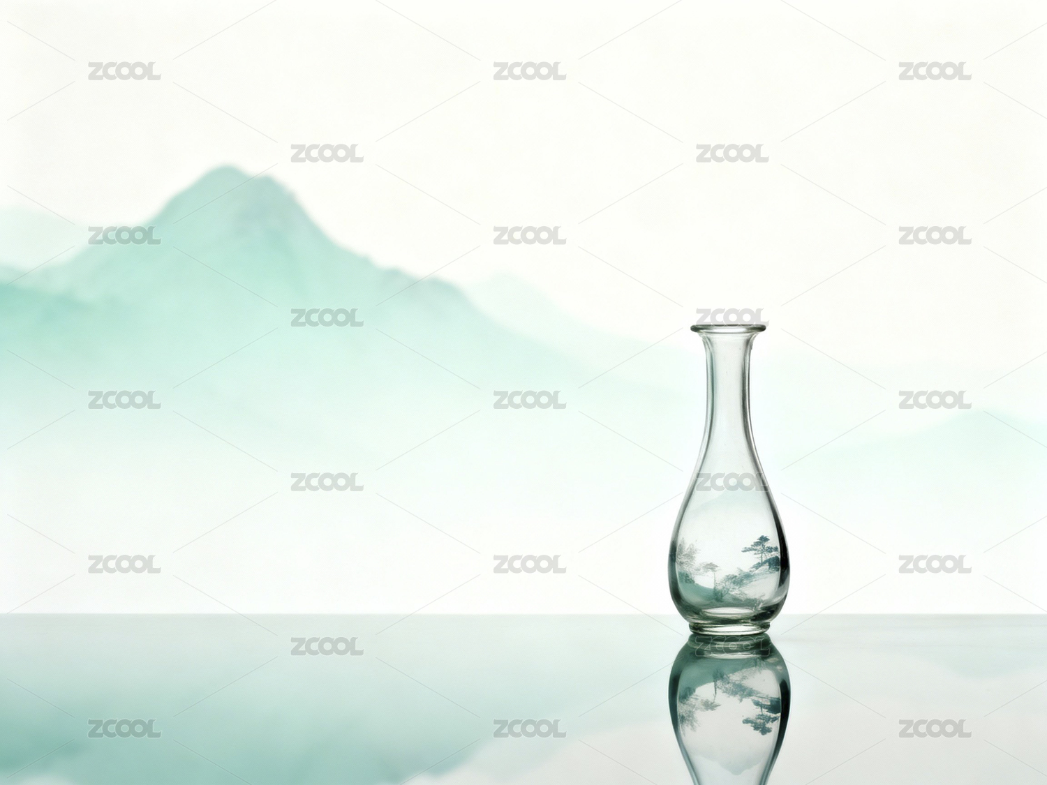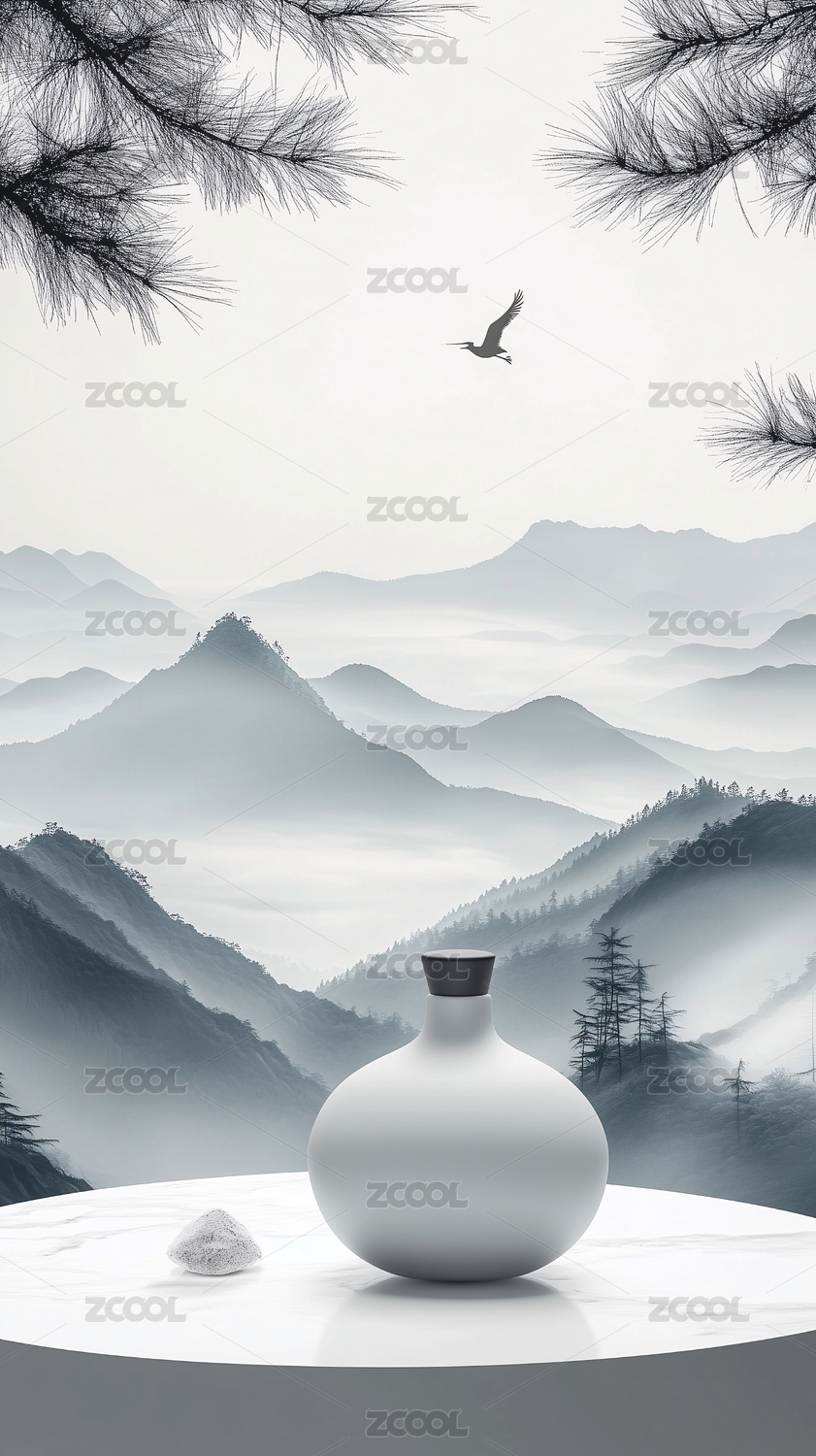 水墨远山与透明花瓶留白背景