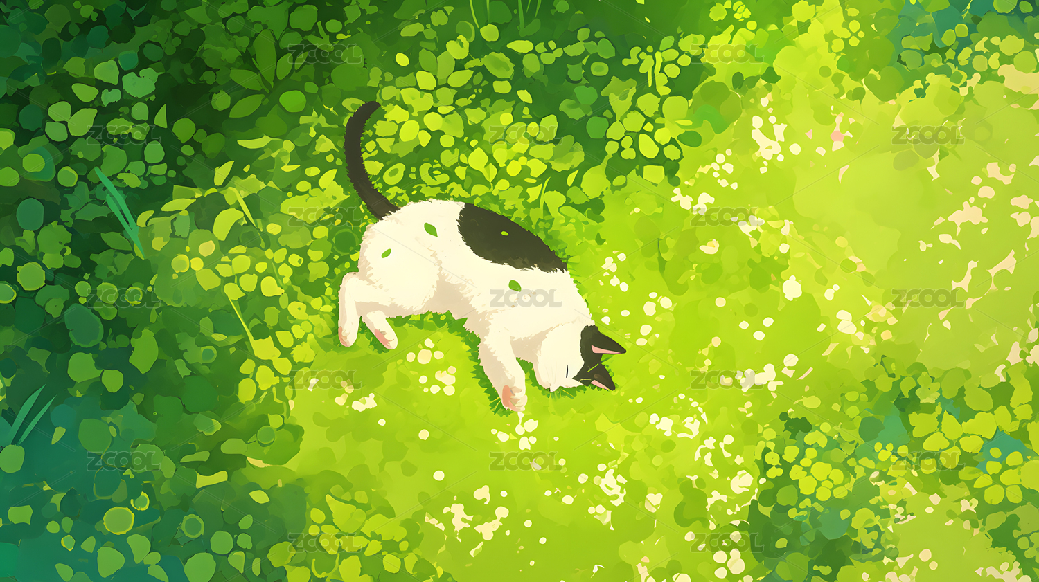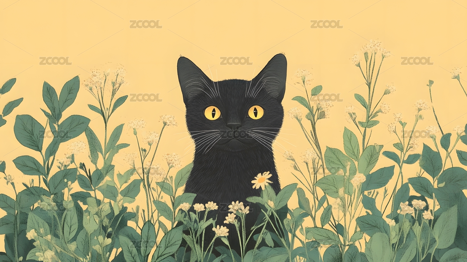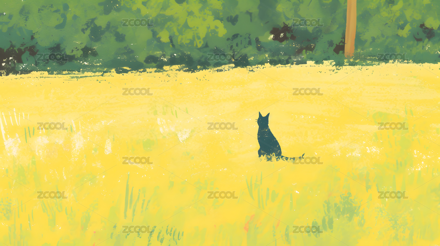 宁静,倒影,插画,花朵,自然,治愈,户外,绿草地,小黑猫,草地