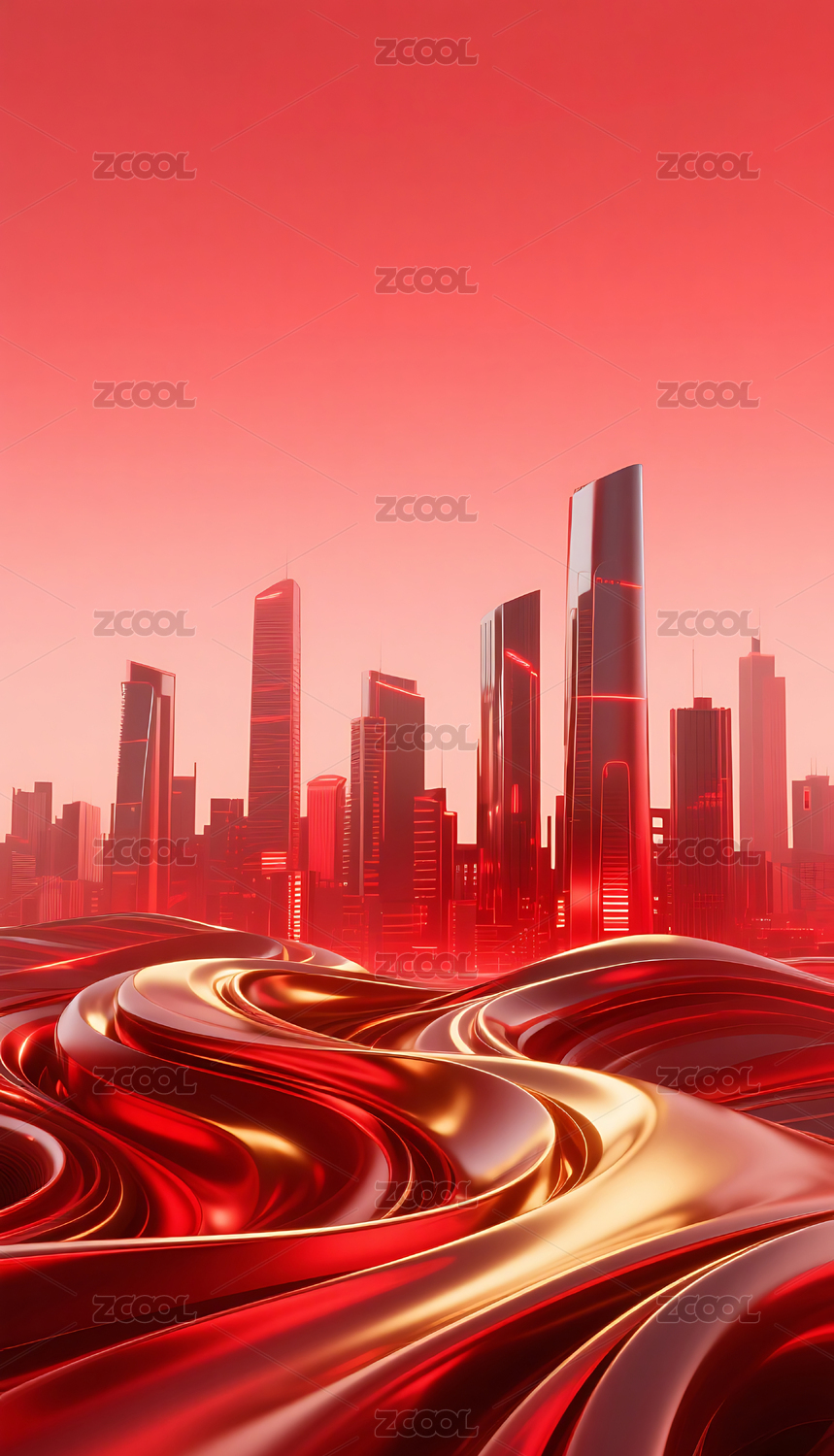 红色流动金属质感城市建筑背景