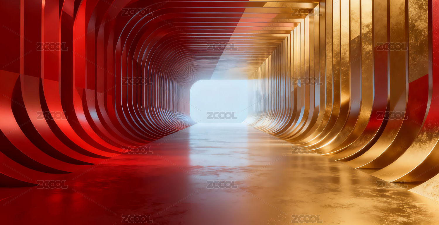 抽象红金色隧道走廊三维场景