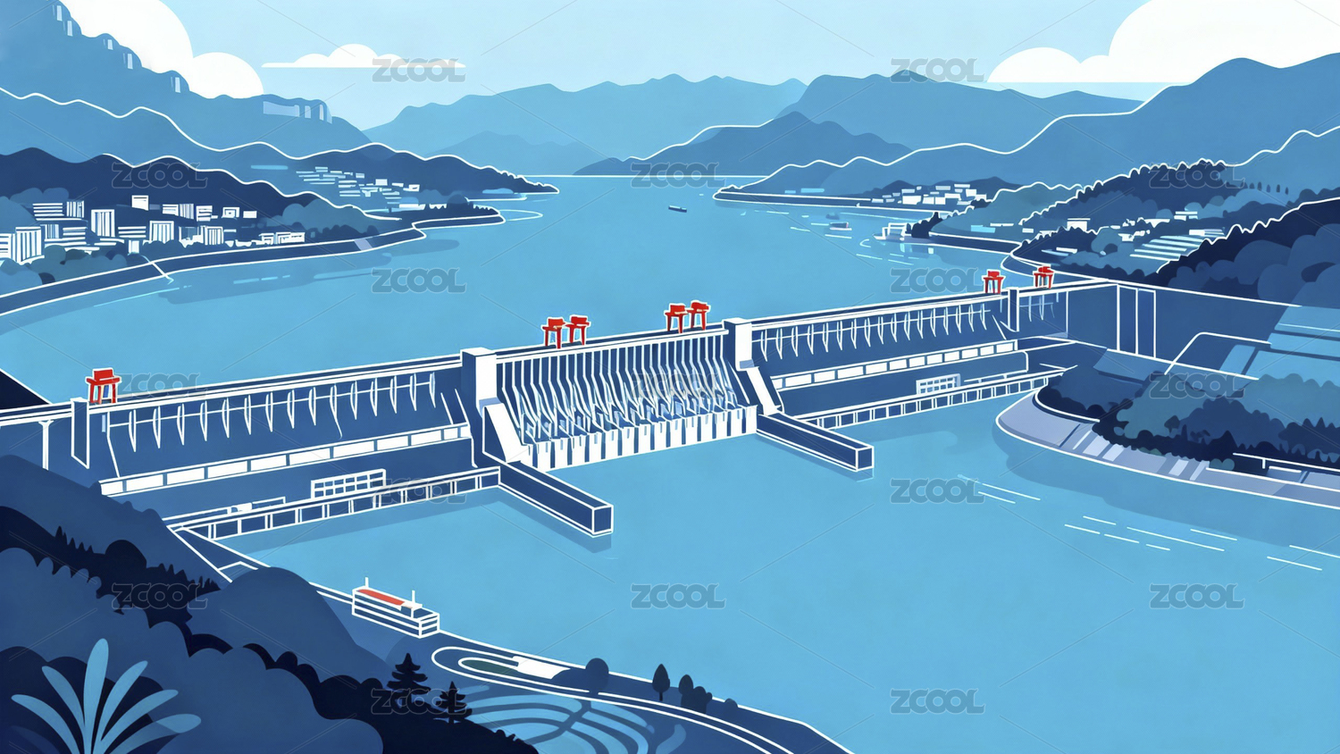 水电站,大坝,水利工程,插画,河流,山脉,水库,闸门,水流,建筑