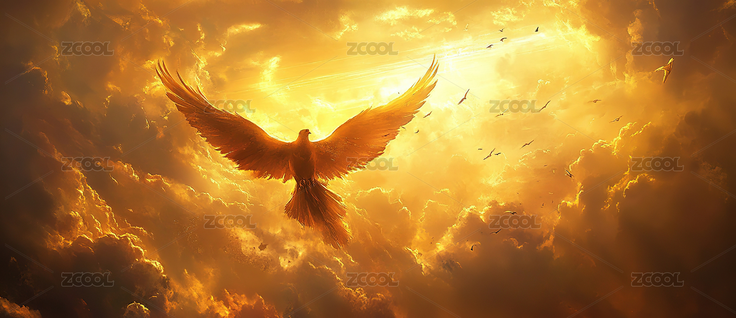蔚蓝天空中展翅飞翔的金色鸟儿