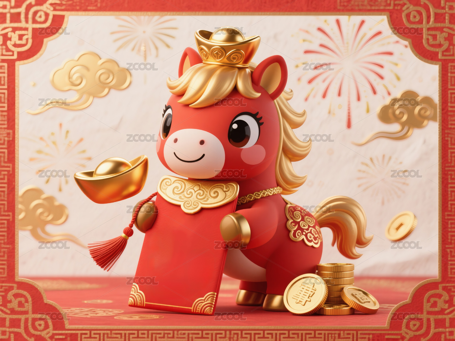 2026,春节,喜庆,新年,卡通,小马,红色,生肖,吉祥,可爱