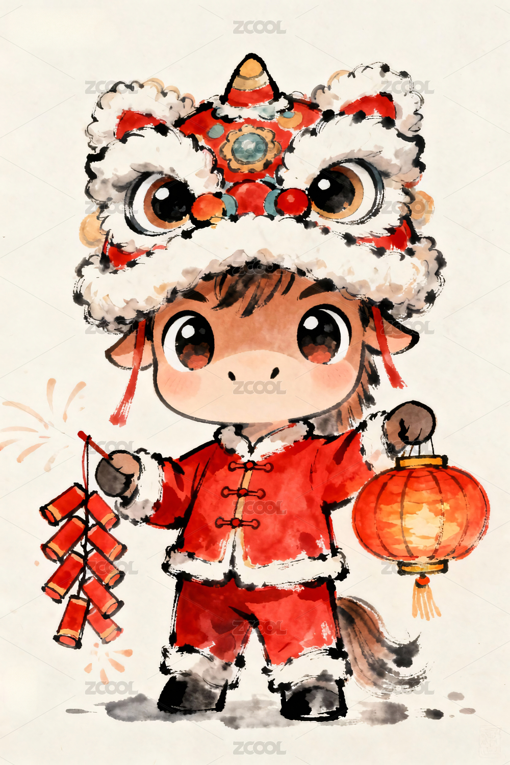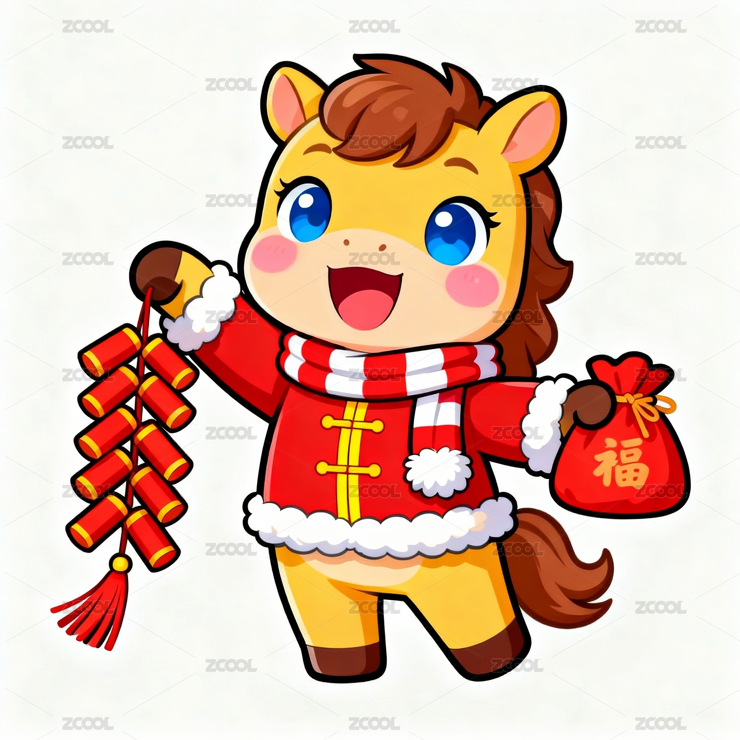 卡通,小马,春节,舞狮头,鞭炮,拜年,红色,唐装,喜庆,中国风