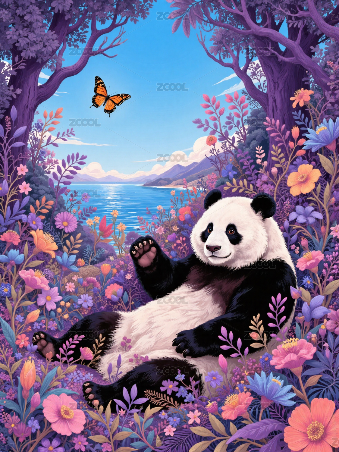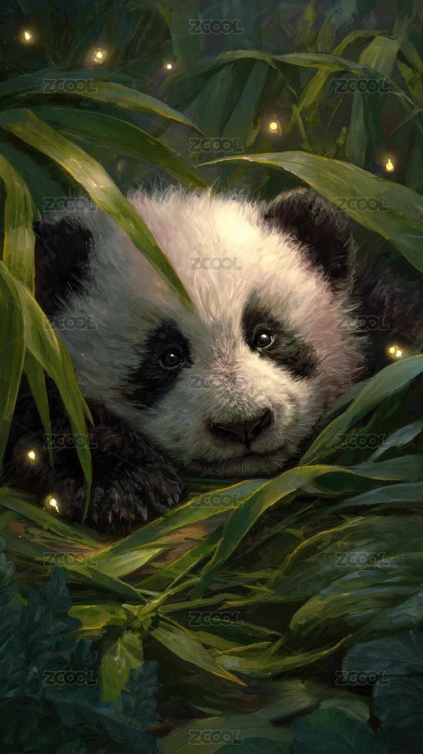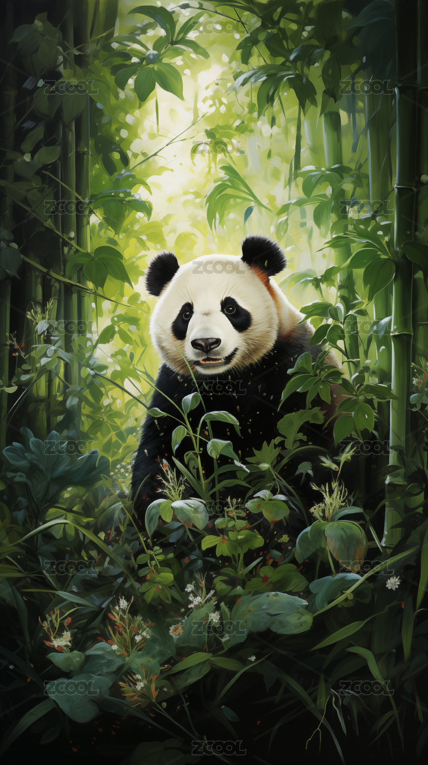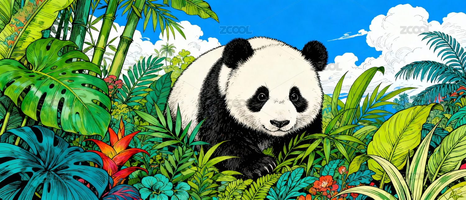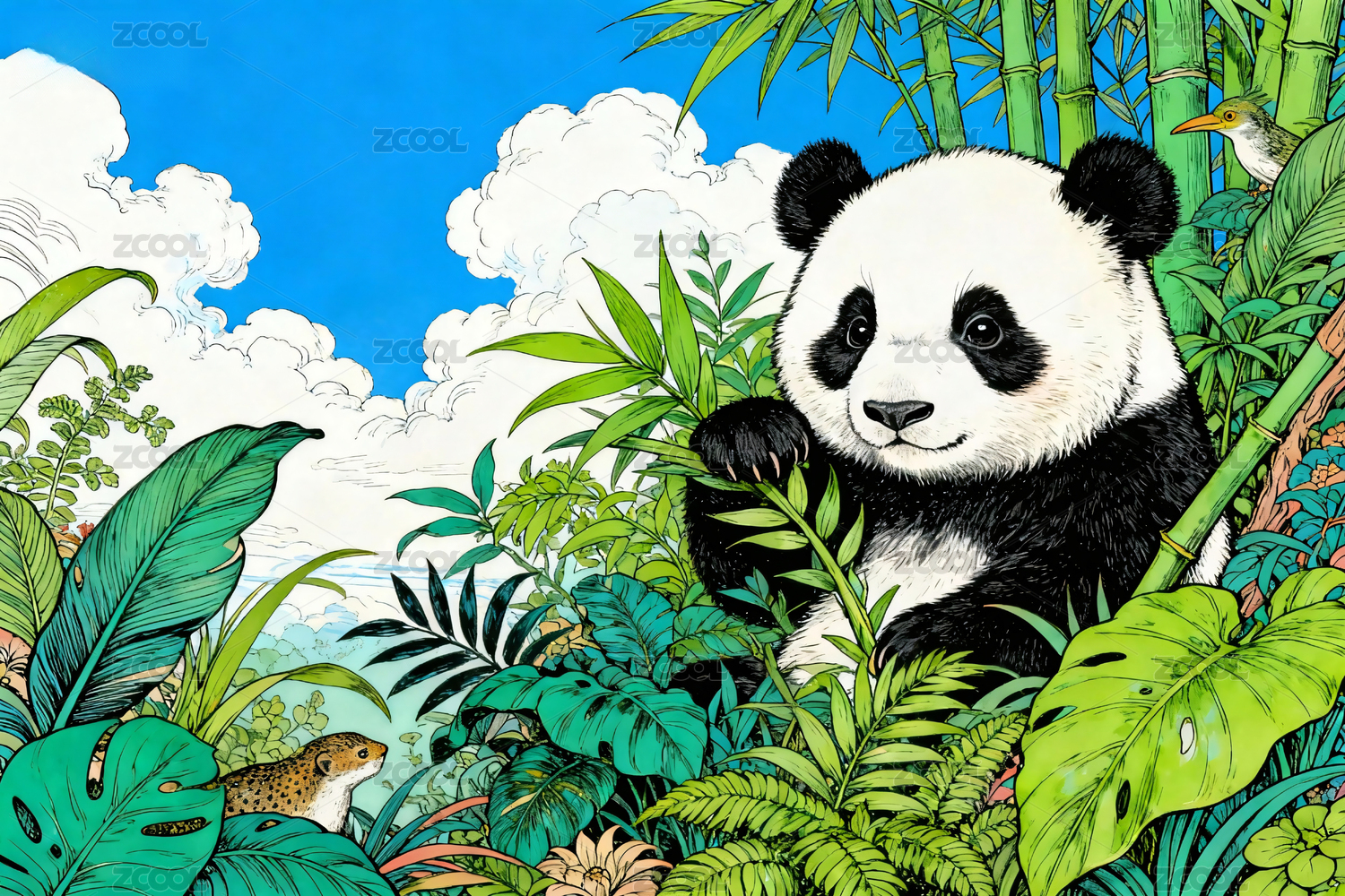 熊猫,热带雨林,竹林,竹子,绿叶,蓝天,白云,插画,野生动物,自然