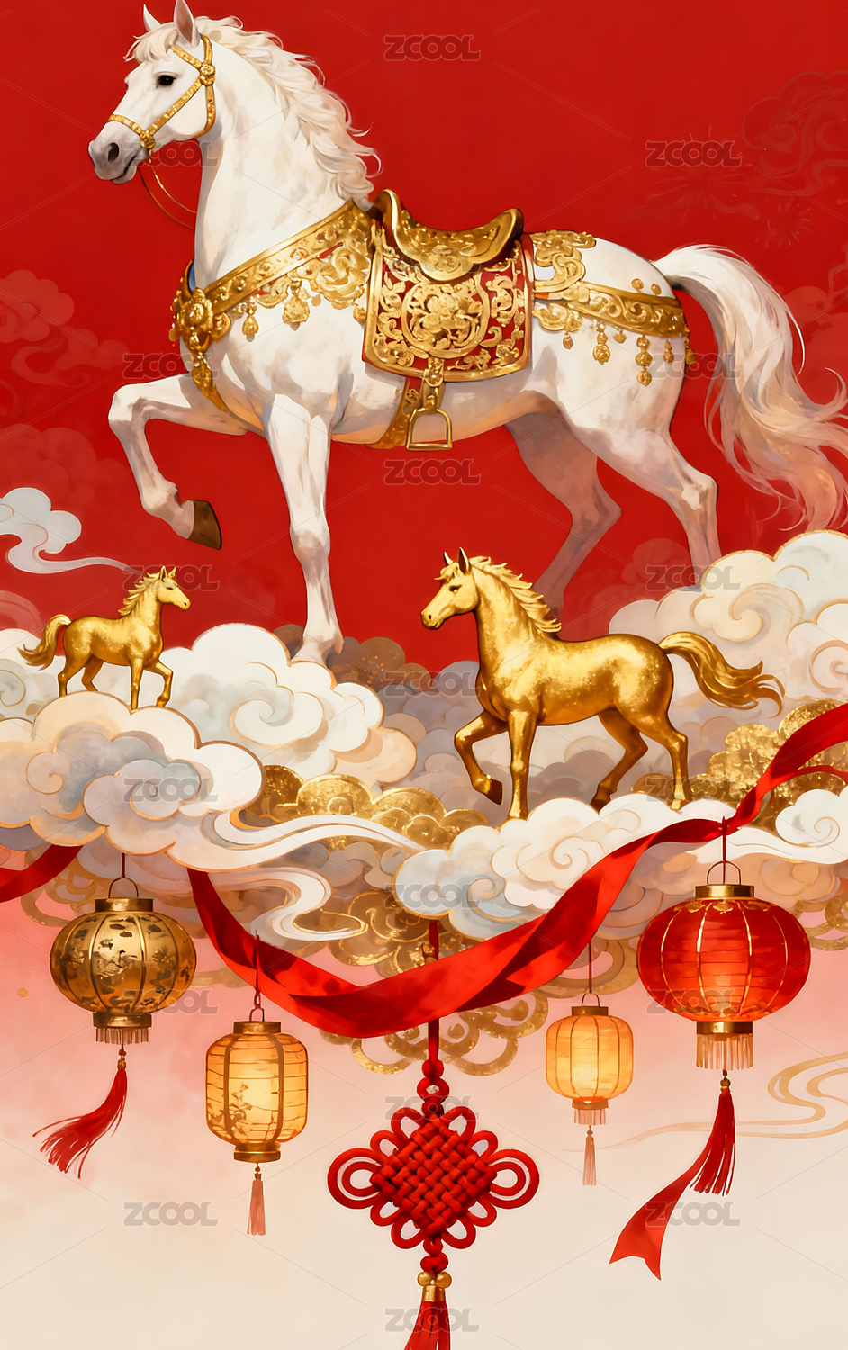 白马,红色,背景,祥云,彩带,中国风,祥瑞,传统,纹样,喜庆