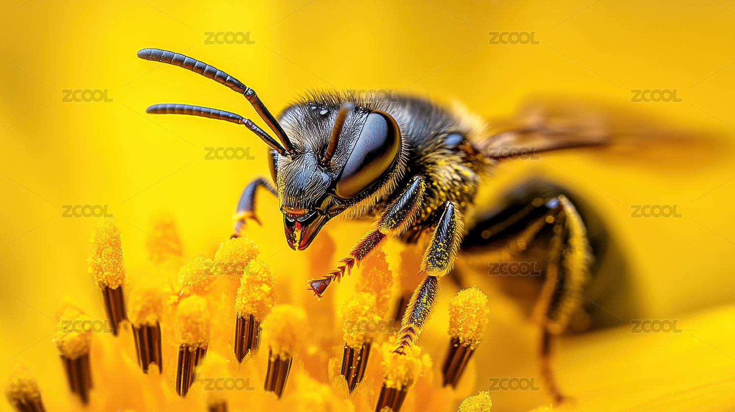 蜜蜂特写镜头聚焦于黄色花朵上的细节