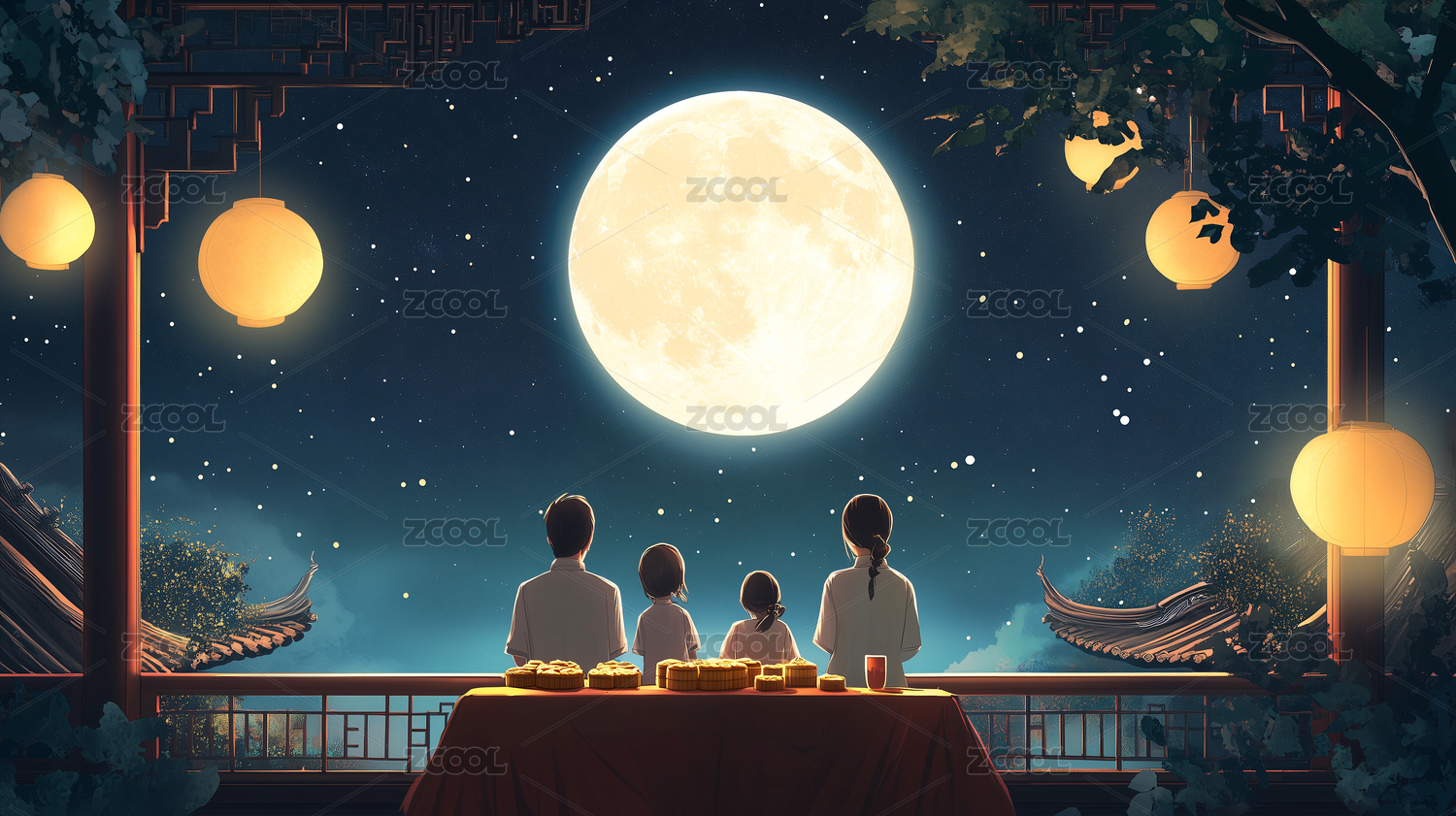 中秋,佳节,卡通风格,萌系画风,中国风,玉兔,兔子,赏月,满月,祥云