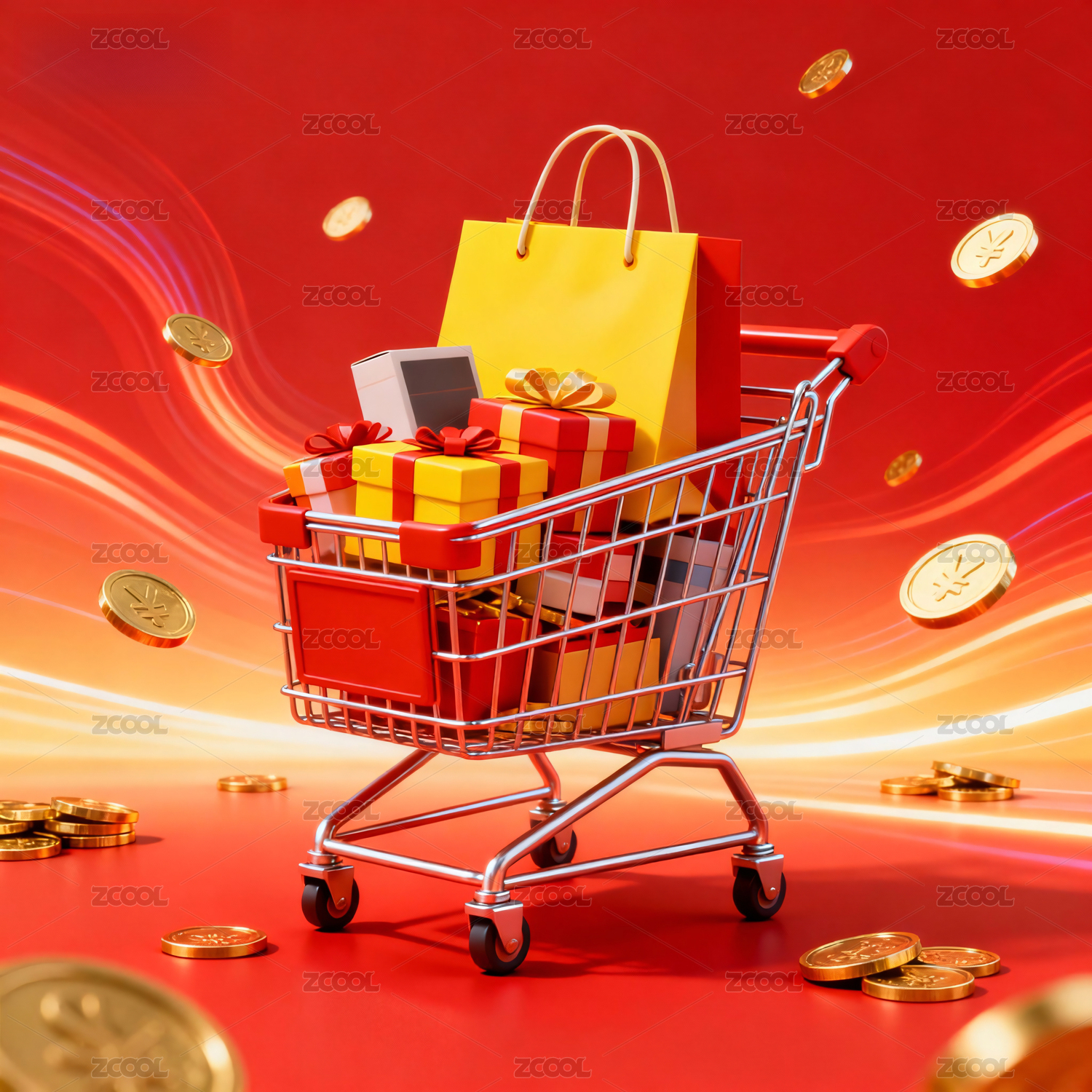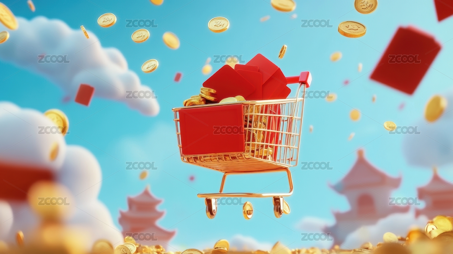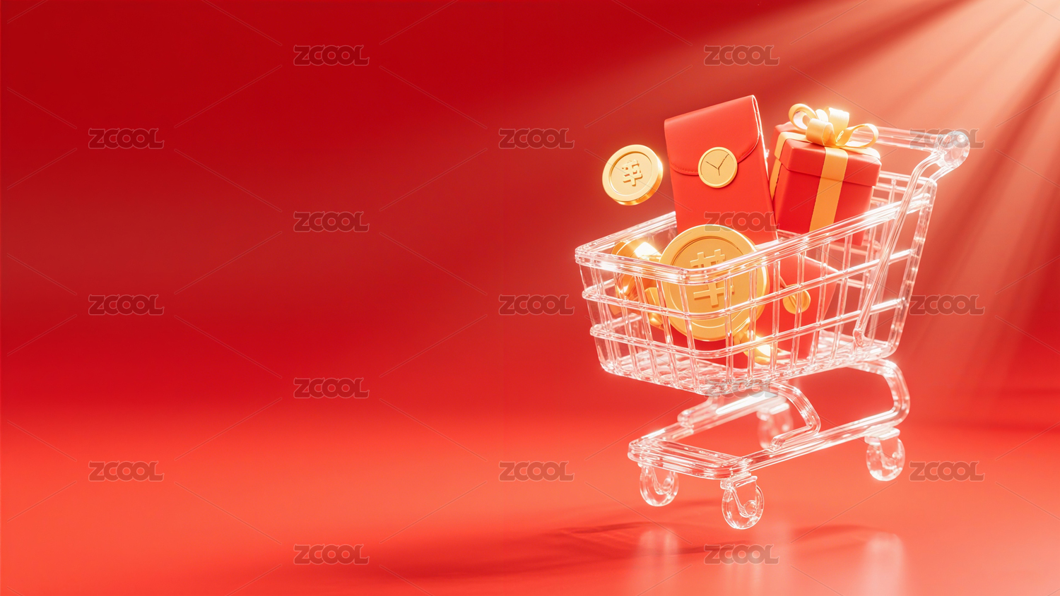 购物车,礼物,金币,红色,背景,喜庆,促销,节日,购物,消费