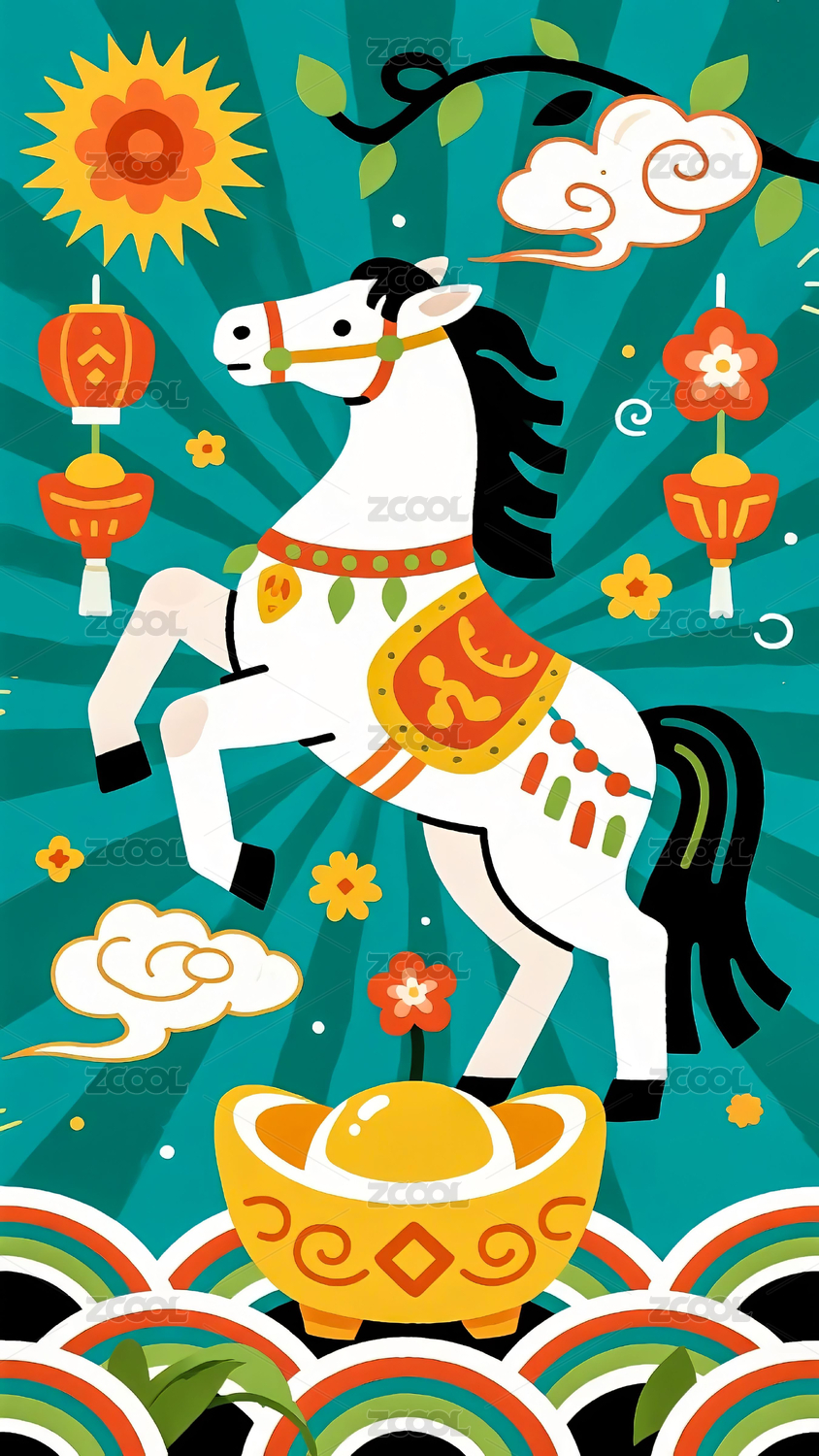 红色骏马与传统元素插画