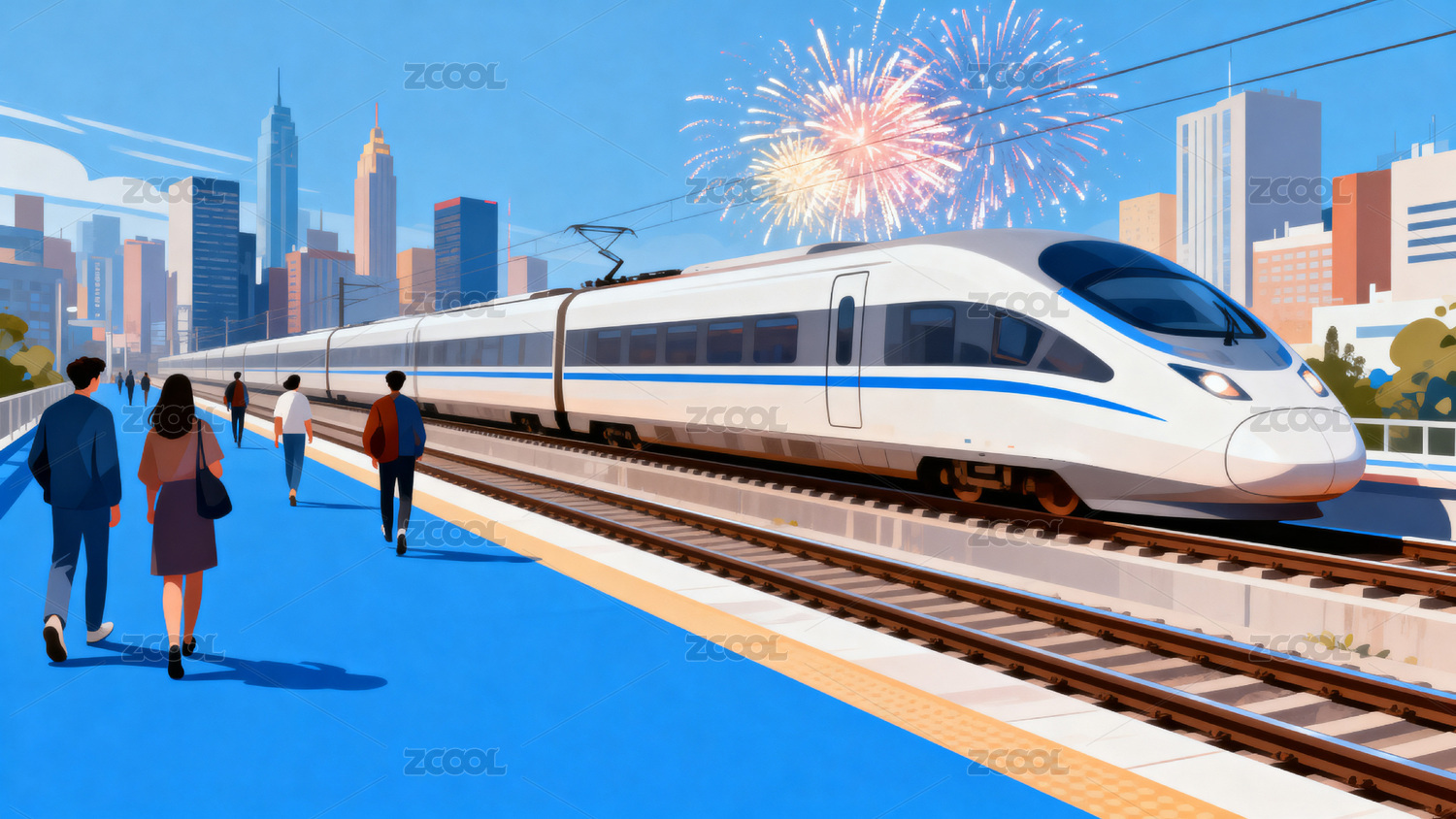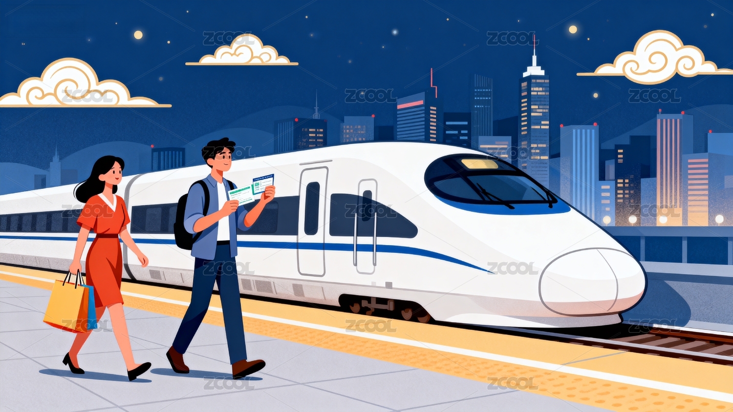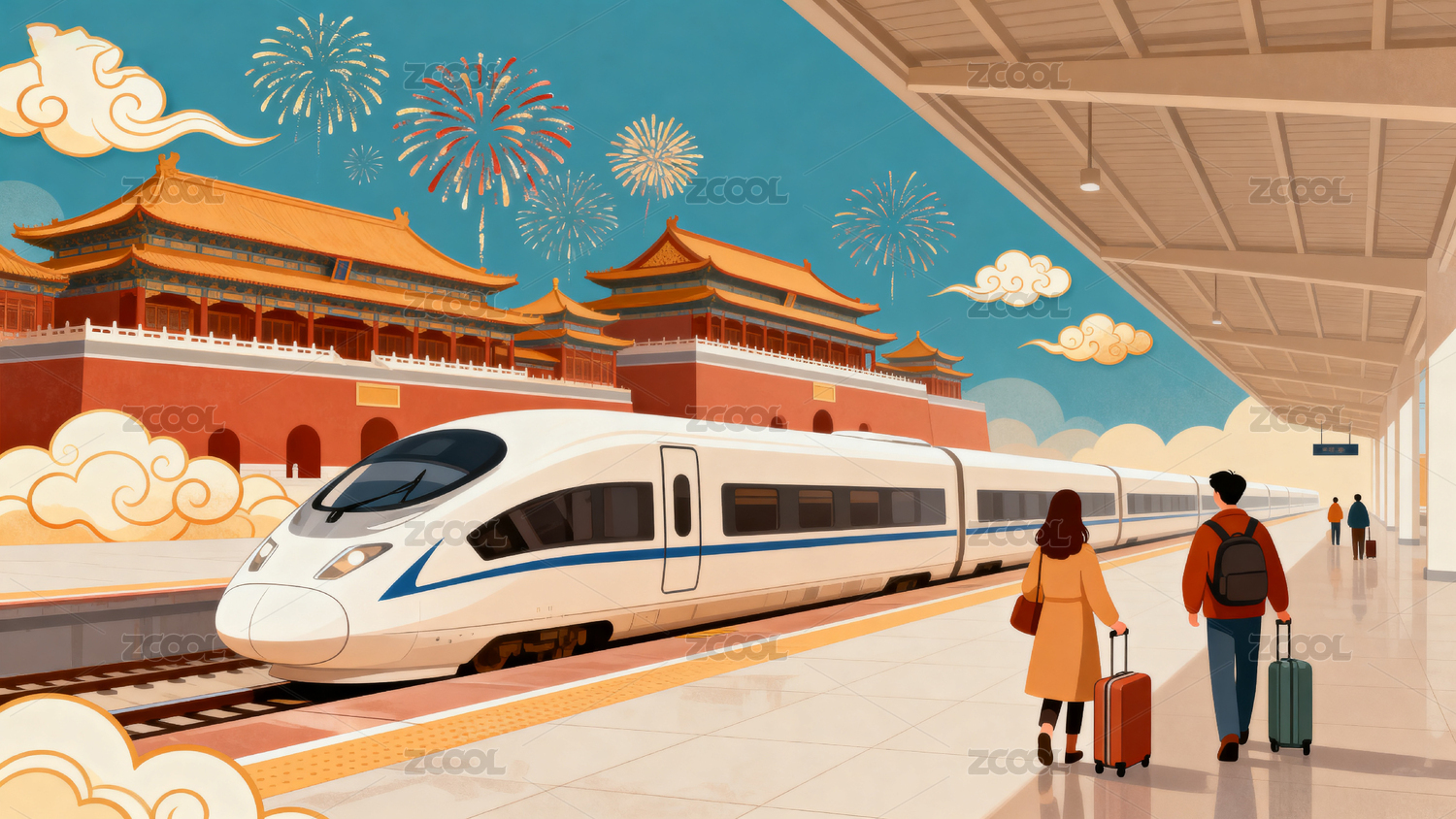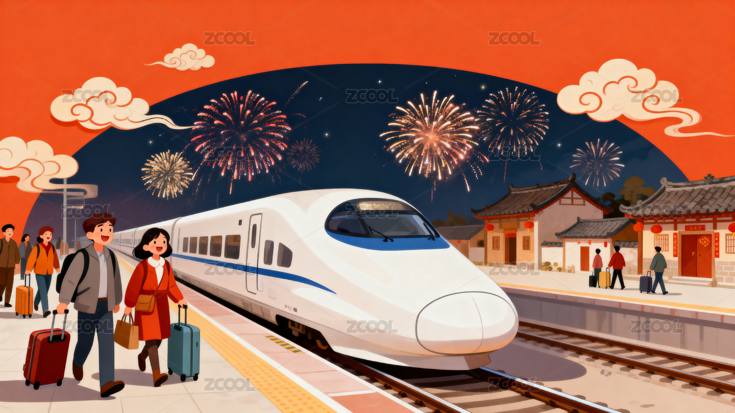 卡通手绘春运火车高铁动车春节返乡回家插画