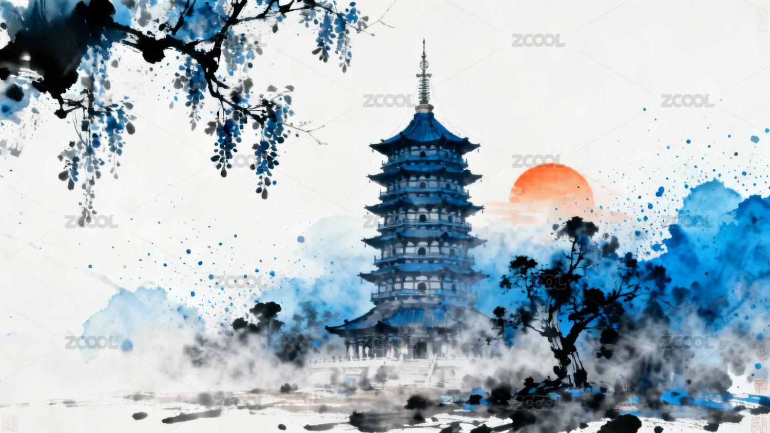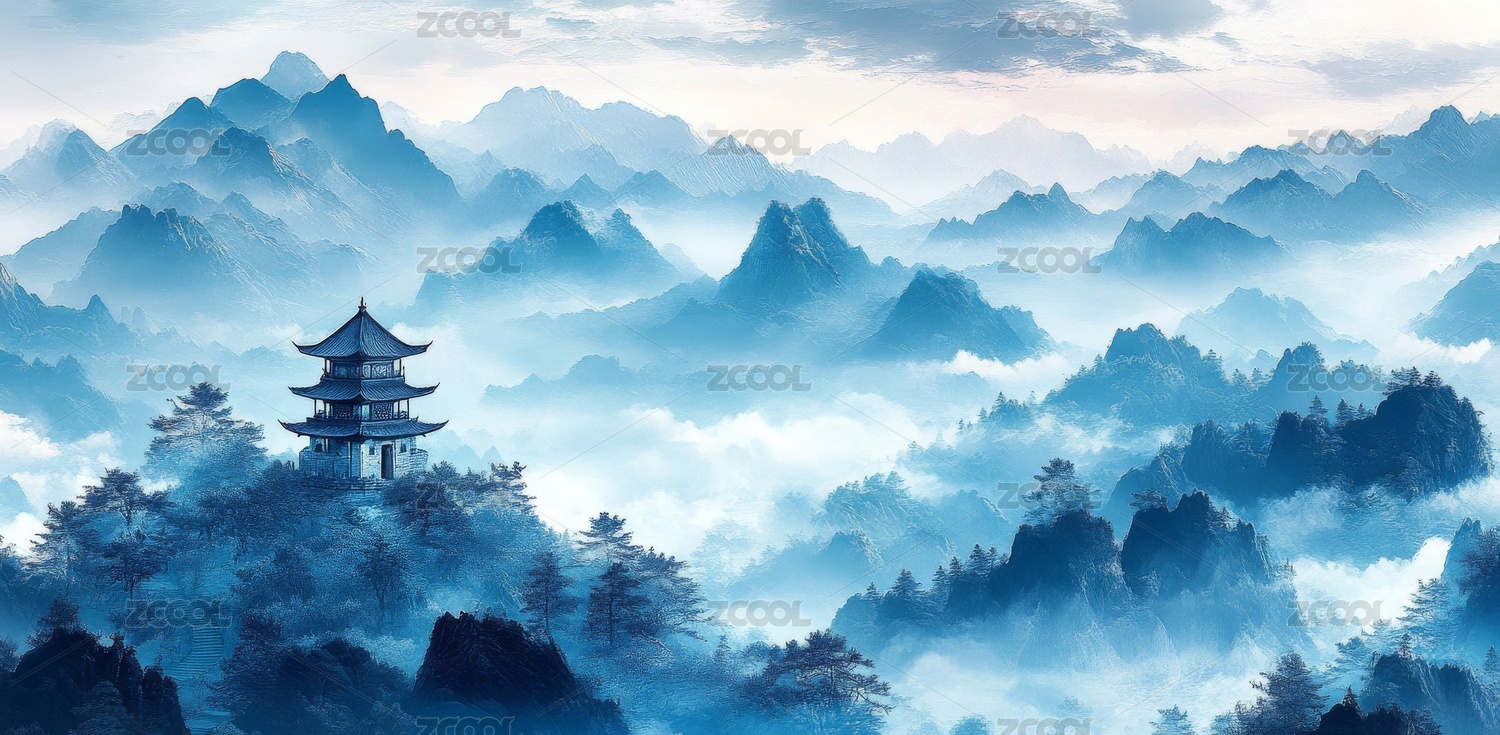 天空,建筑,绿色,自然,山峰,金色,传统,静谧,晨曦,古塔