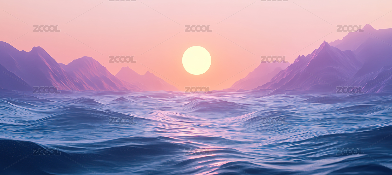 粉色天空下波涛汹涌的海面与巍峨山峰