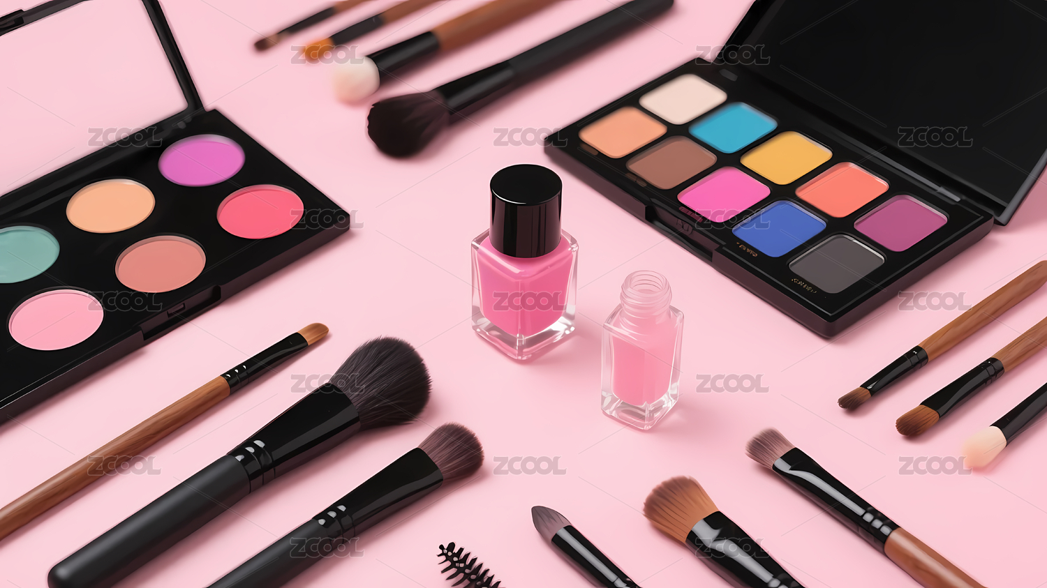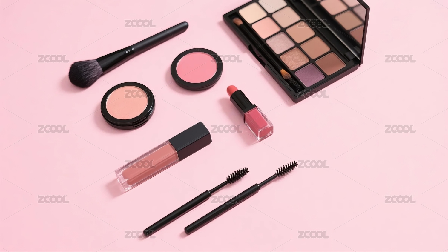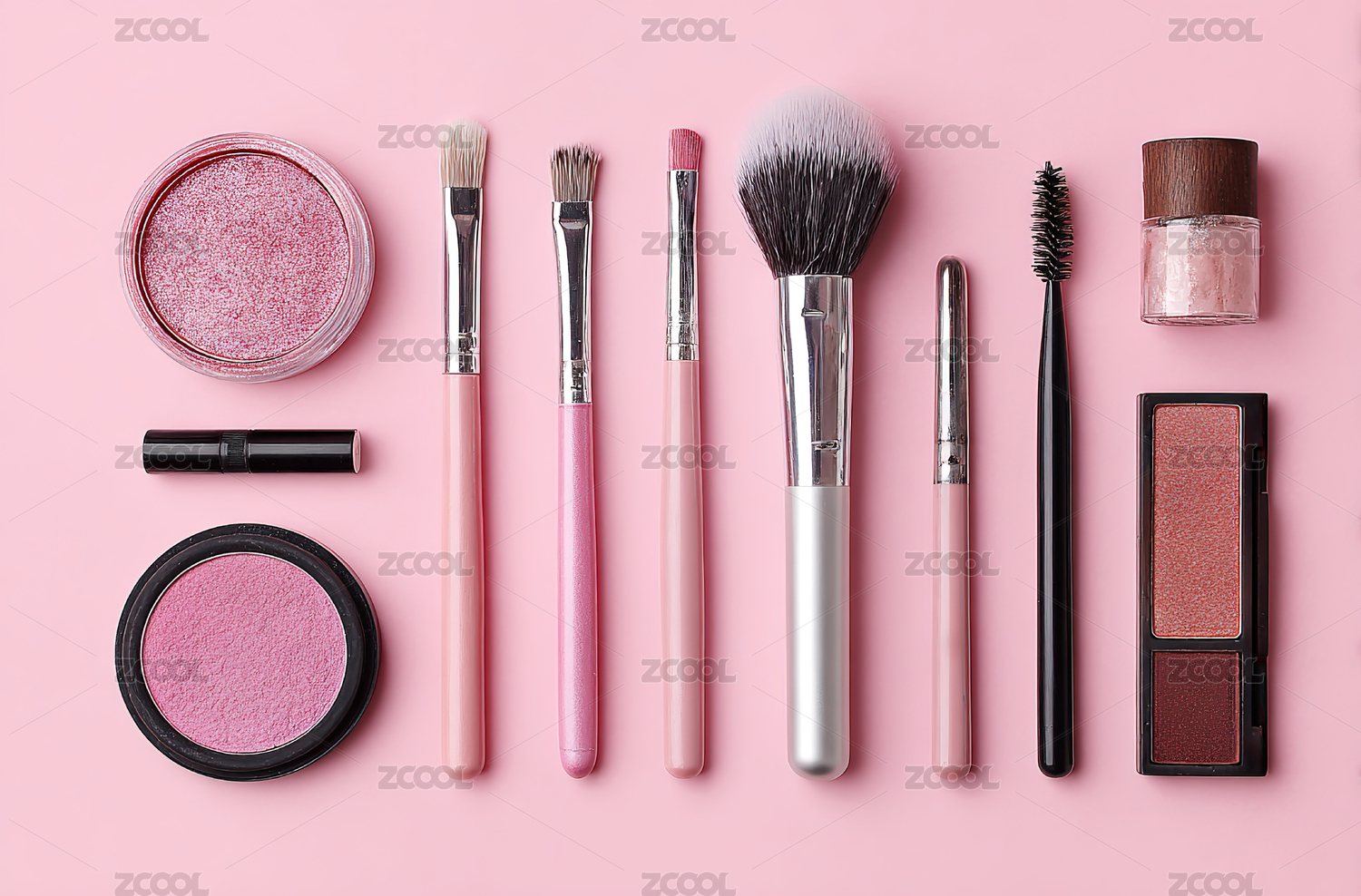 正上方视角各种美妆化妆品摆放在粉色背景
